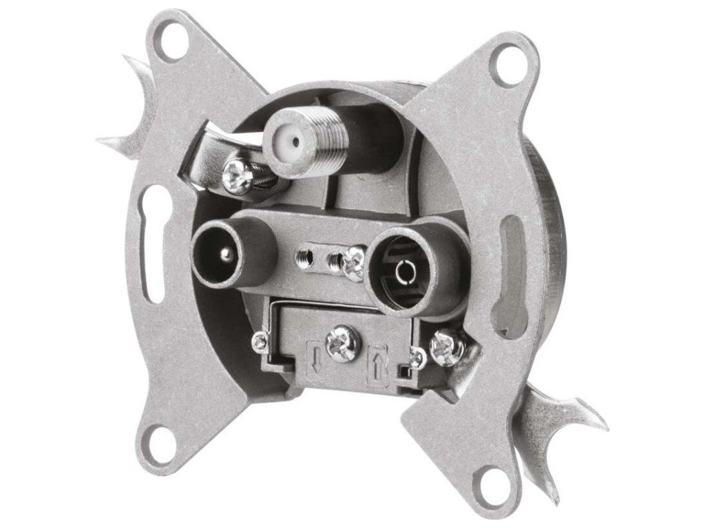 Účastnická zásuvka EU 3303 satelitní koncová s útlumem 3 dB a zdířkami pro TV + Rádio + SAT. Účastnická zásuvka propojuje např. anténu s televizí, satelitem nebo set-top-boxem. SAT zdířka průchozí pro stejnosměrné napětí a lze ji také využít pro průchod napájení předzesilovače v terestrické anténě.