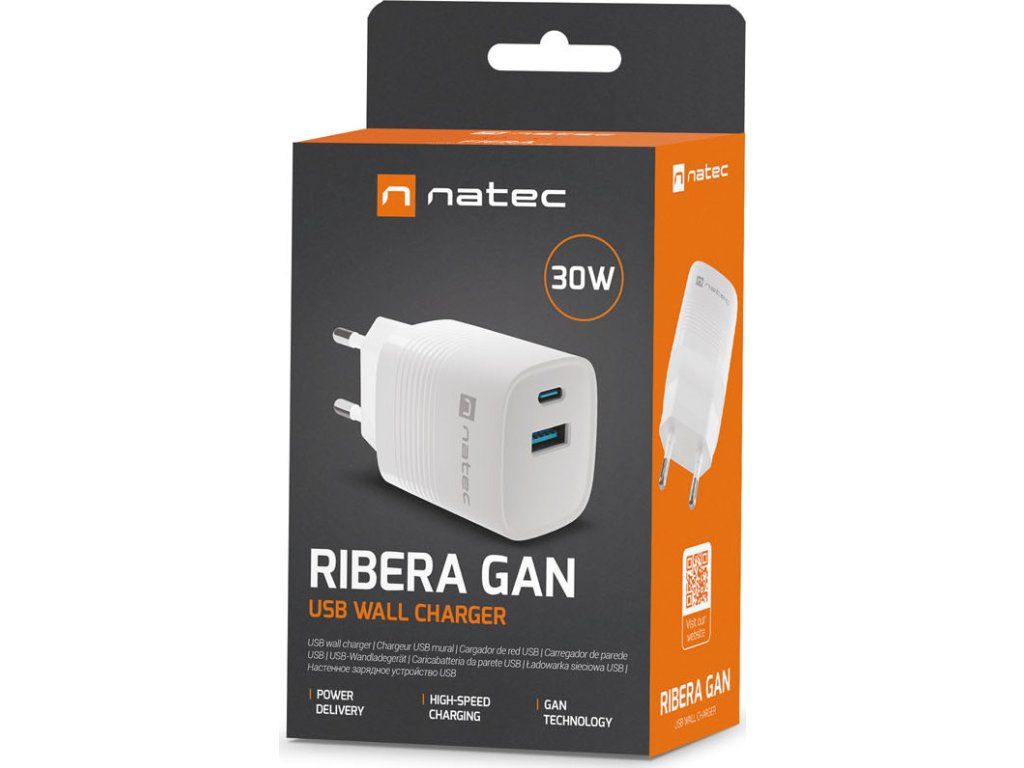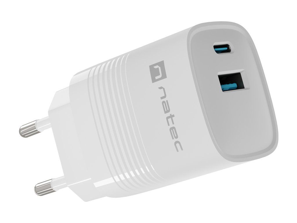 Universální USB nabíječka Natec RIBERA GaN 30W, 1X USB-A, 1X USB-C, Bílá