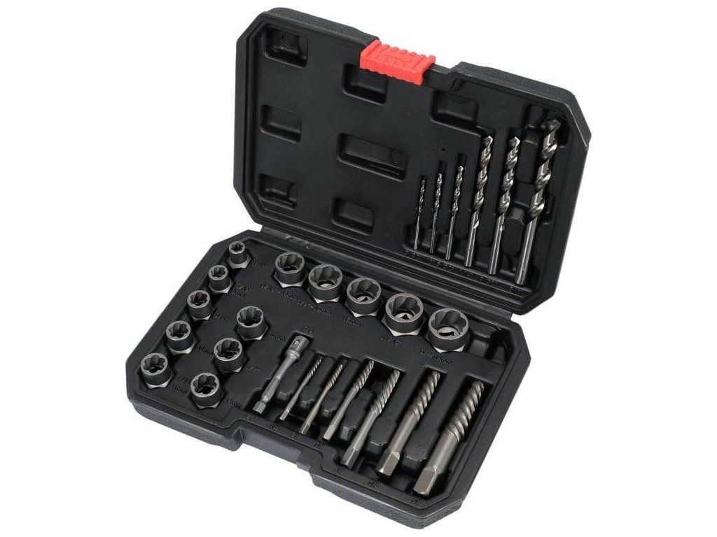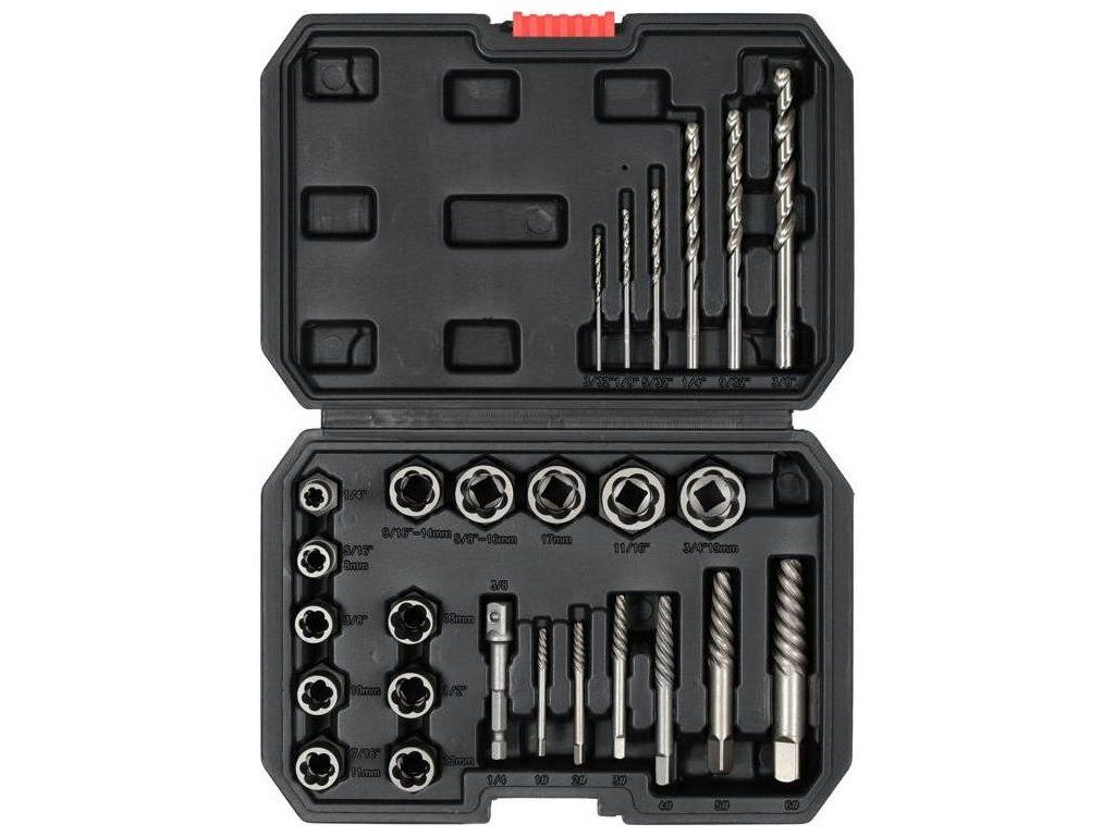 obsah sady vytahovače: 1/4", 8 mm, 3/8", 10 mm, 11 mm, 12 mm, 1/2", 13 mm, 14 mm, 16 mm, 17 mm, 11/16", 19 mm extraktory: 1, 2, 3, 4, 5, 6 vrtáky: 2,4 mm, 3,2 mm, 4 mm, 6,4 mm, 7,2 mm, 9,5 mm 3/8" HEX adaptérDoplňkové parametry
