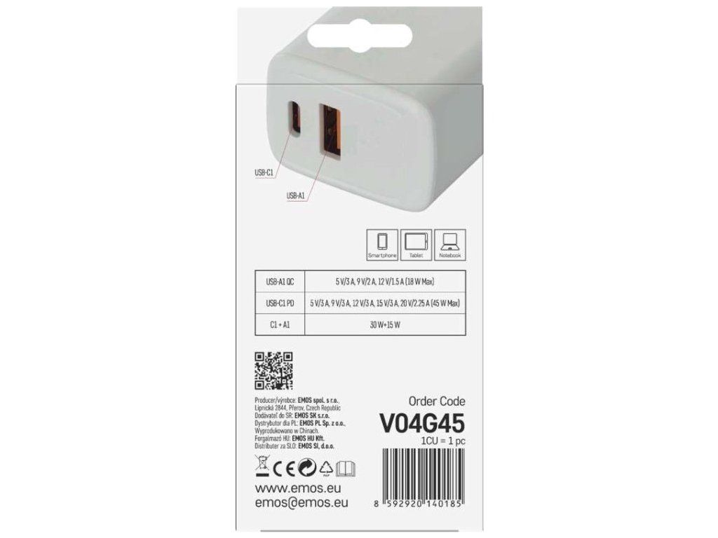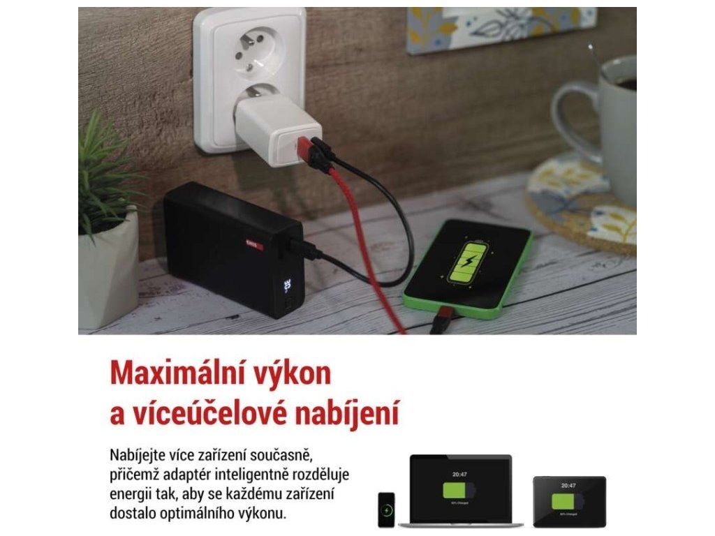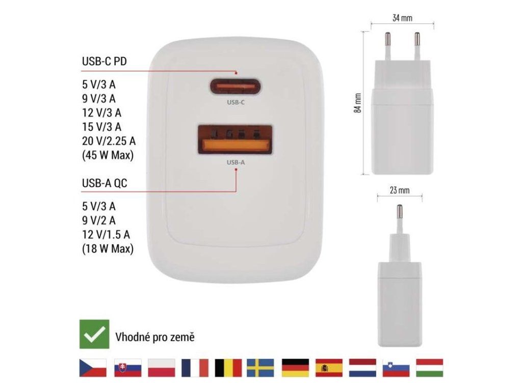 | Max. výstup 1× USB: | A: 5 V/3 A – 9 V/2 A – 12 V/1,5 A (18 W), C: 5 V/3 A – 9 V/3 A – 12 V/3 A – 15 V/3 A – 20 V/2,25 A (45 W) |
