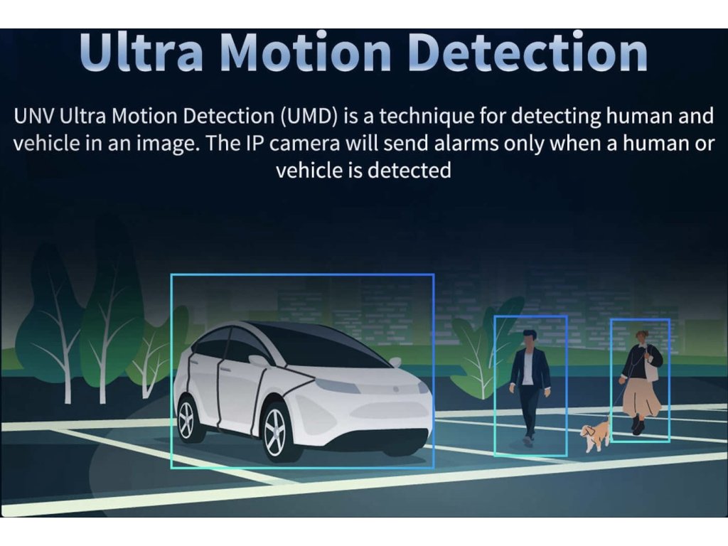 IPC2314LE-ADF28KM-WP využívá pokročilé videoanalytické funkce Ultra Motion Detection. Kamera rozpozná člověka nebo motorové vozidlo, na základě čehož teprve vyhodnotí detekci pohybu a udělá značku na časové ose v záznamovém zařízení, podle které pak rychle dohledáte, kdy došlo k zájmové události. Ultra Motion Detection tak velmi efektivně šetří Váš čas a urychluje dopadení pachatele. Díky funkci Ultra Motion Detection se kamera nenechá ovlivnit pavučinou před objektivem, chvěním listů, zvířectvem, deštěm, světlomety automobilů atp. Kamera je dále vybavena videoanalytickými funkcemi v podobě překročení čáry či narušení střežené zóny, které, ovšem, jsou na základě pixelové analýzy Human Body Detection, čili se hodí zejména do prostředí se stabilní scénou, jakou jsou interiéry. Pokud byste chtěli analýzy na základě rozpoznání člověka, doporučujeme kamery z řady Prime.