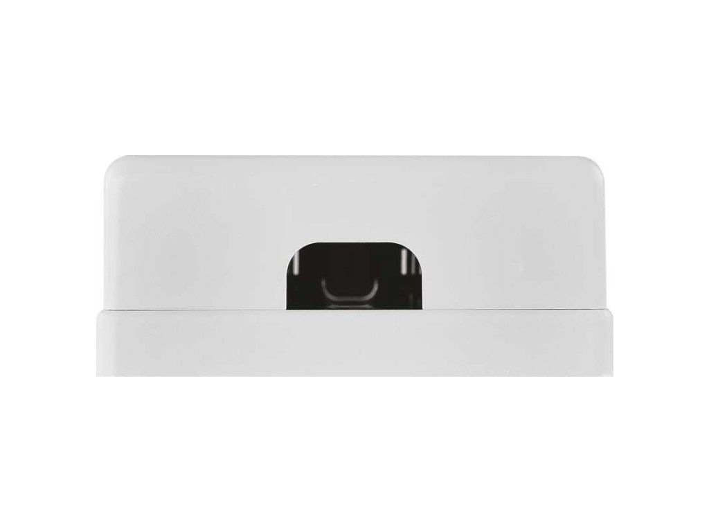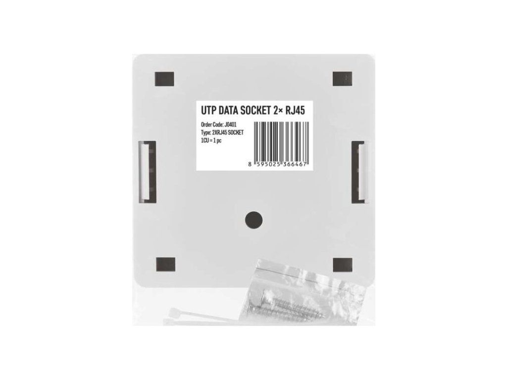 UTP datová zásuvka RJ45 se dvěma konektory. Zásuvka má spodní vývod a je určená primárně k instalaci na zeď. Rozměry UTP datové zásuvky jsou 26 × 62 × 60 mm.