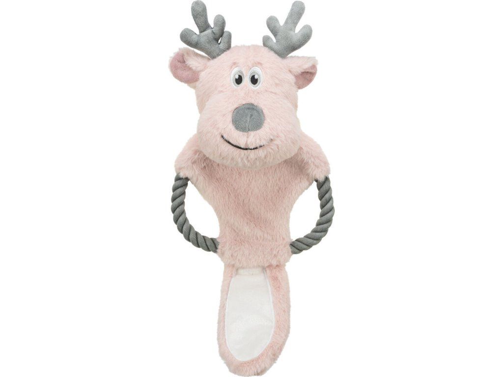 Vánoční sob na laně, šustící, 47 cm, plyš/bavlněné lano, růžová/šedá