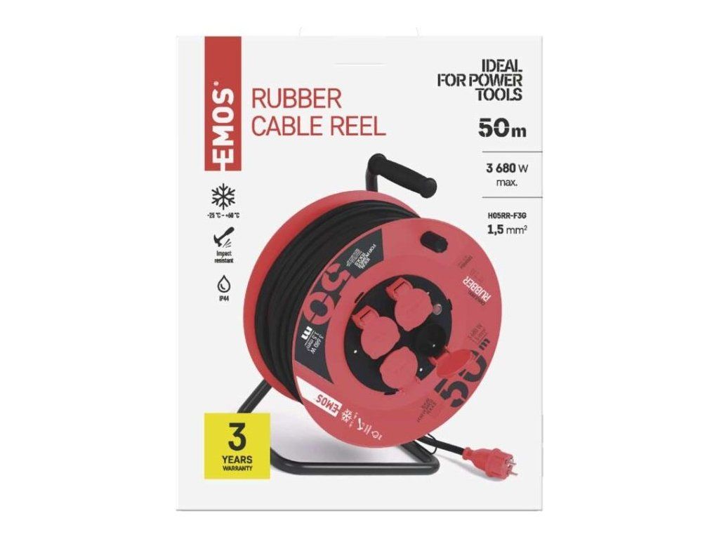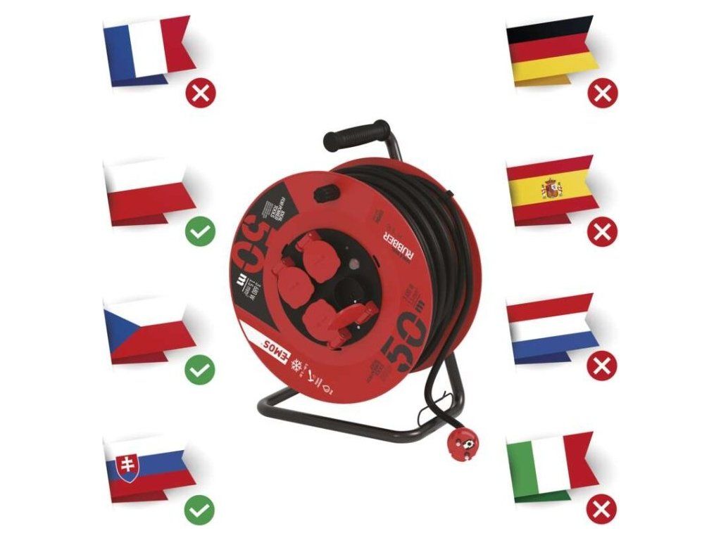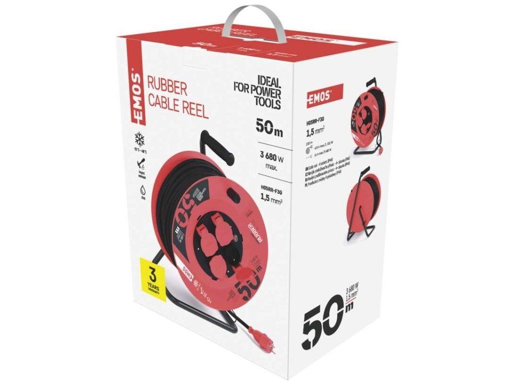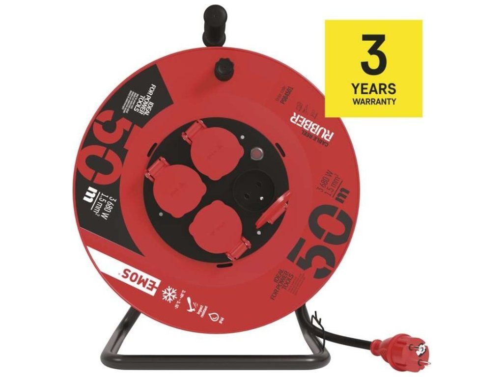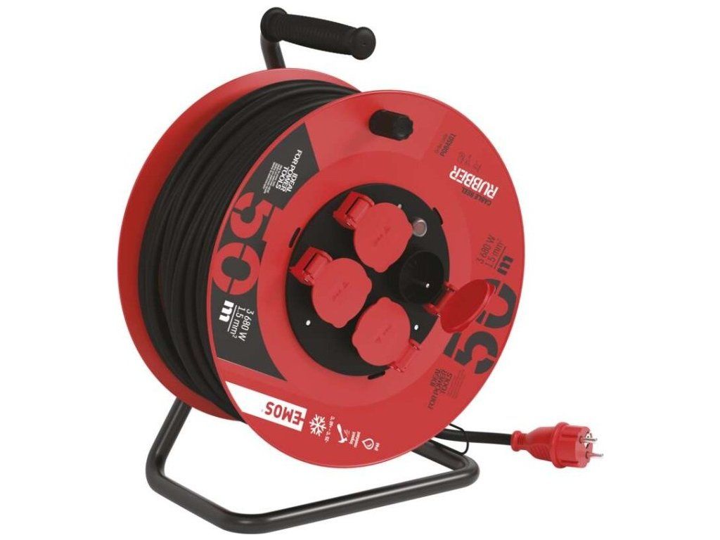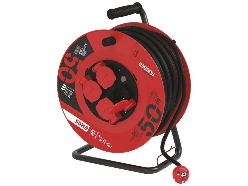 Venkovní prodlužovací kabel na bubnu 50 m / 4 zásuvky / černý / guma / 230 V / 1,5 mm2