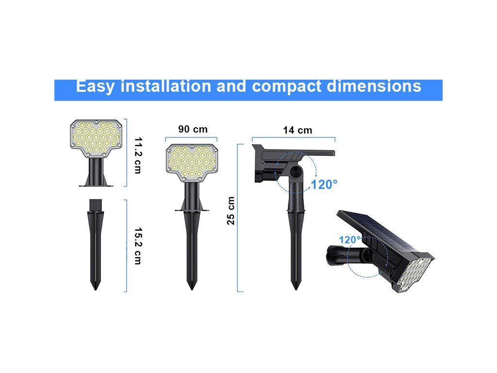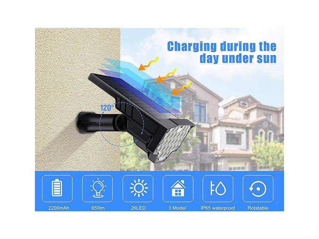 Solární LED světlo s 26 vysoce svítícími LED diodami je ideální k osvětlení venkovních prostor bez možnosti připojení k elektrické síti, jako je např. zahrada, vstup do domu atd. Díky solárnímu napájení je LED světlo zcela soběstačné a nezávislé na napájení z elektrické sítě. Jeho instalace je velice jednoduchá. Ať už světlo nainstalujete na zeď, nebo zapíchnete do země, jste schopni osvětlit jakékoliv prostory za několik okamžiků a bez další potřeby kabeláže.