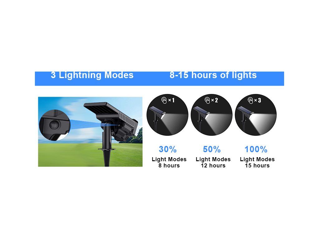 Baterie v solárním světle poskytuje dostatečný výkon pro celonoční osvětlení. Doba svitu záleží na intenzitě světla. Podle vybraného světelného režimu vám LED světlo vydrží svítit 8-15 hodin.