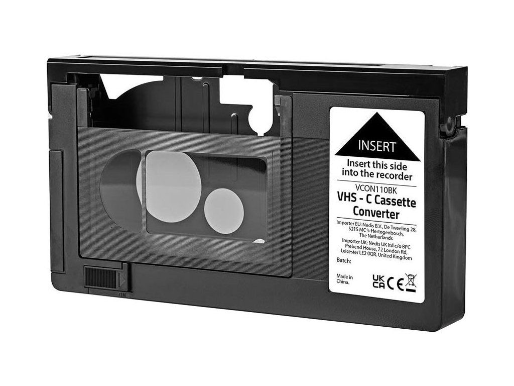 Nedis kazetový adaptér VHS-C na VHSAdaptér pro záznam nebo sledování kazet VHS-C na standardním videorekordéru VHS (VCR). K automatickému otevření přední části za účelem založení nebo vyjmutí kazety je zapotřebí AA baterie (není součástí). Není kompatibilní s 8mm páskou. Používejte pouze kazety s označením VHS-C.