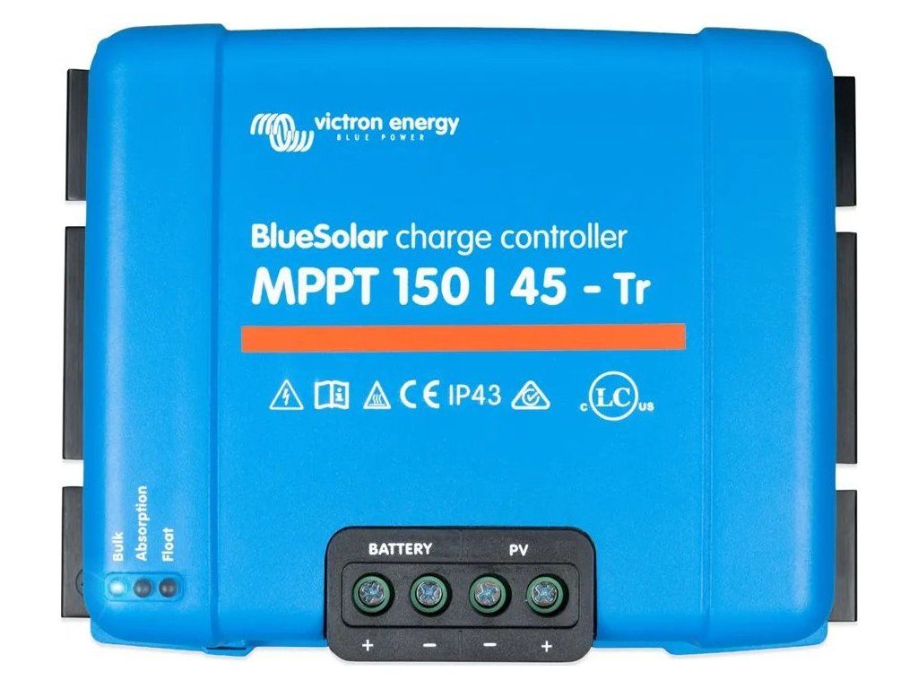 Victron BlueSolar 150/45 MPPTRobustní a rychlý MPPT regulátor pro náročné podmínky s napětím panelů až 150 V, maximální nabíjecí proud 45 A. Baterie 12/24/48 V, FV max. 650/1300/2600 Wp.