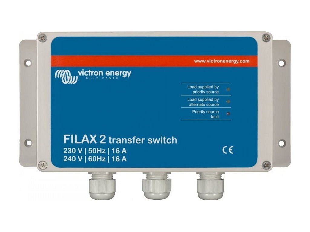 Victron Filax 2Přepínač Filax byl vyvinut pro přepínání napájení citlivých přístrojů jako např. počítače, průmyslové řídící systémy nebo moderní audiovizuální a zábavná technika z prioritního AC zdroje na druhý alternativní zdroj. Typickým prioritním zdrojem je el. rozvodná síť, generátor nebo jiný zdroj např. místní el. přípojka v přístavu nebo v kempu. Typickým alternativním zdrojem je DC-AC střídač (invertor).