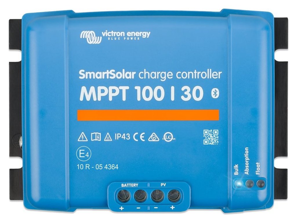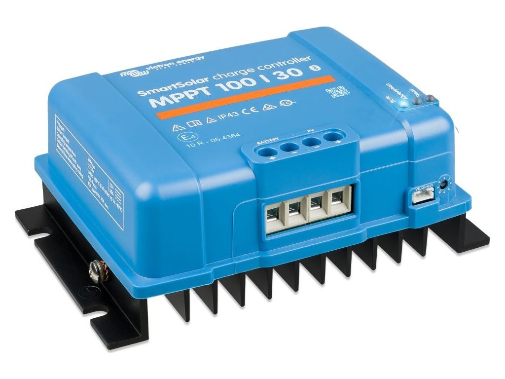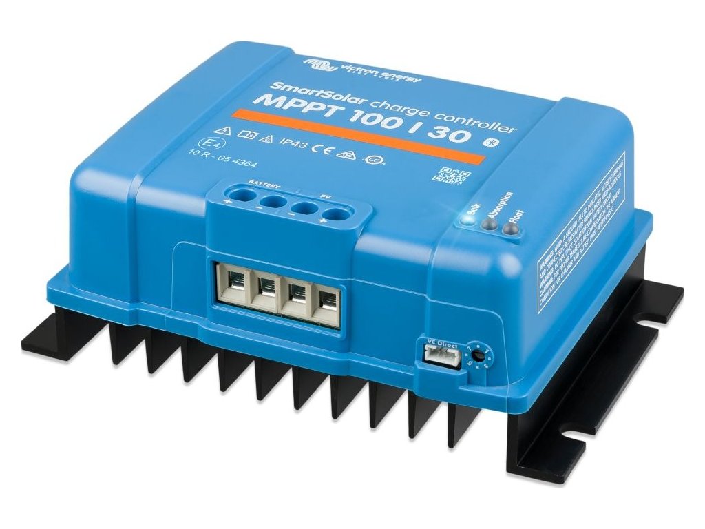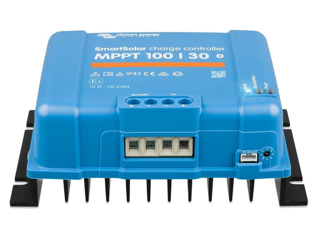 Victron SmartSolar 100/30 MPPTRobustní a rychlý MPPT regulátor pro náročné podmínky s napětím panelů až 100 V, maximální nabíjecí proud 30 A. Baterie 12/24 V, FV max. 440/880 Wp. Vestavěné Bluetooth a VE.direct rozhraní.