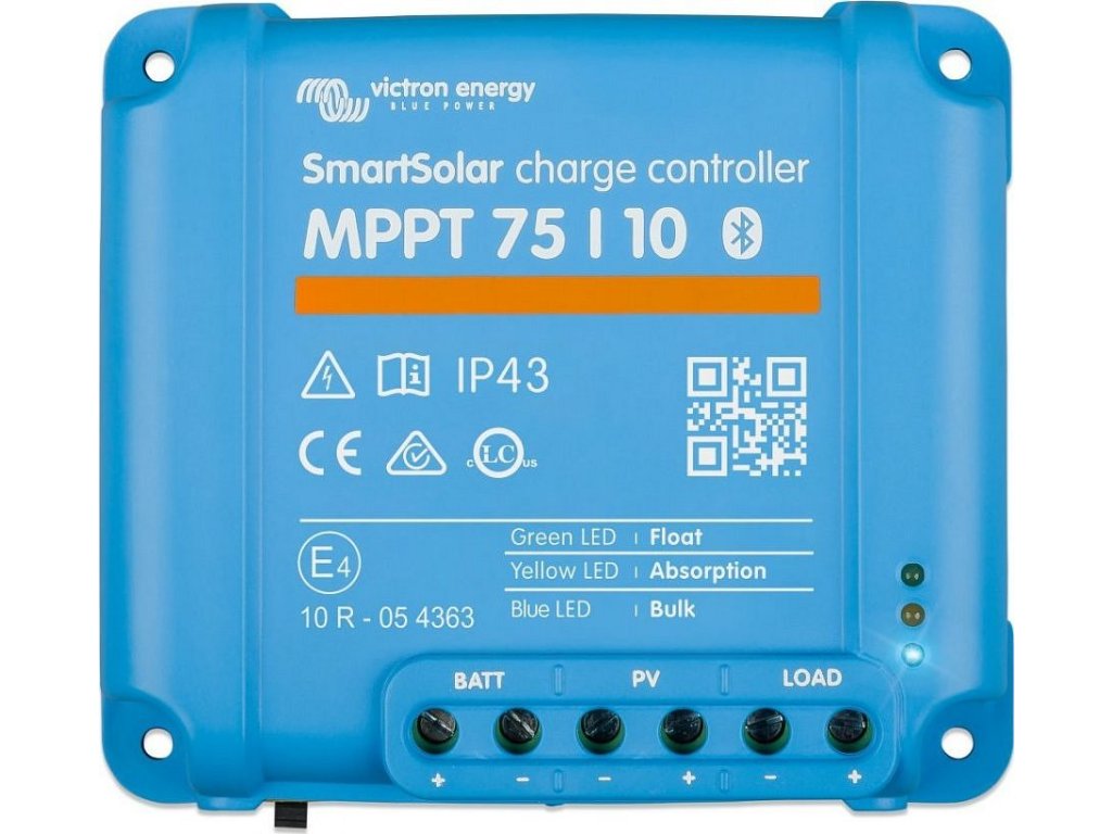Victron SmartSolar 75/10 MPPTRobustní a rychlý MPPT regulátor pro náročné podmínky s napětím panelů až 75 V, maximální nabíjecí proud 10 A. Baterie 12/24 V, FV max. 145/290 Wp. Vestavěné Bluetooth a VE.direct rozhraní.