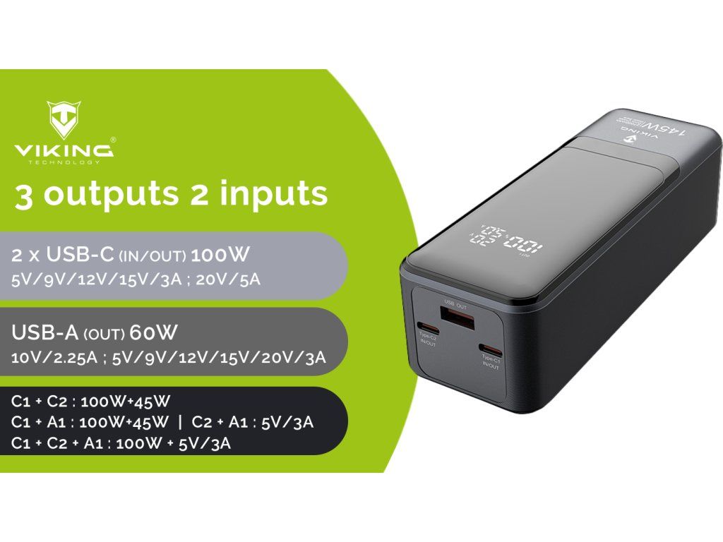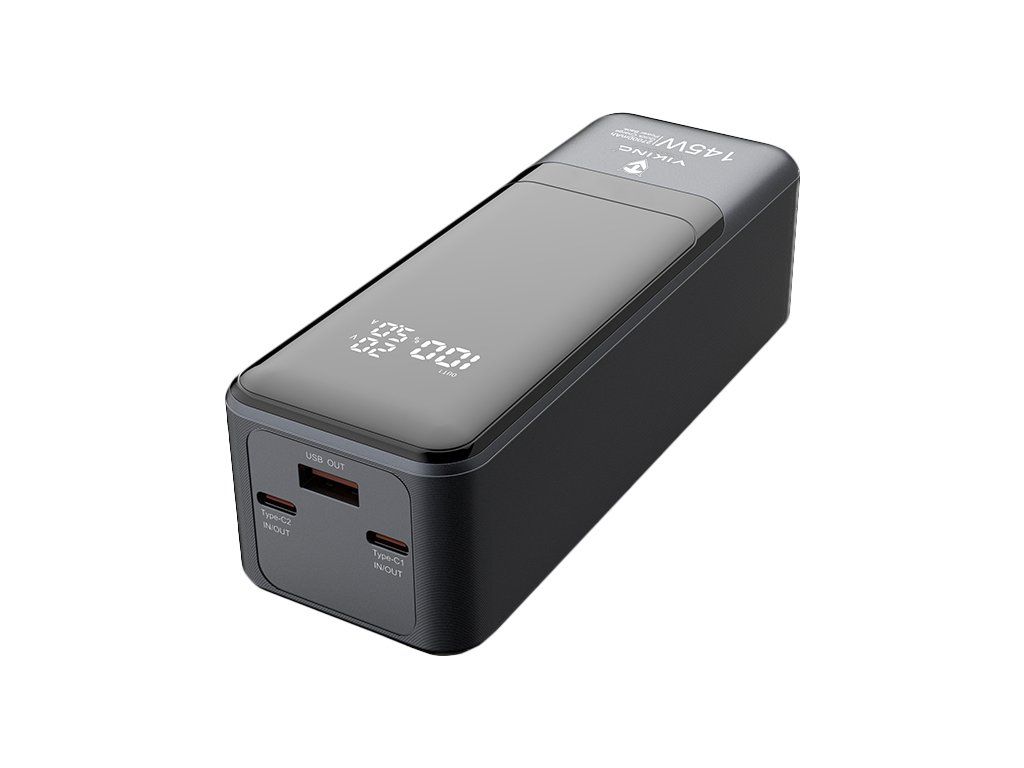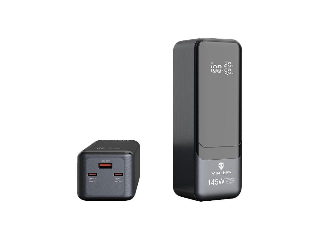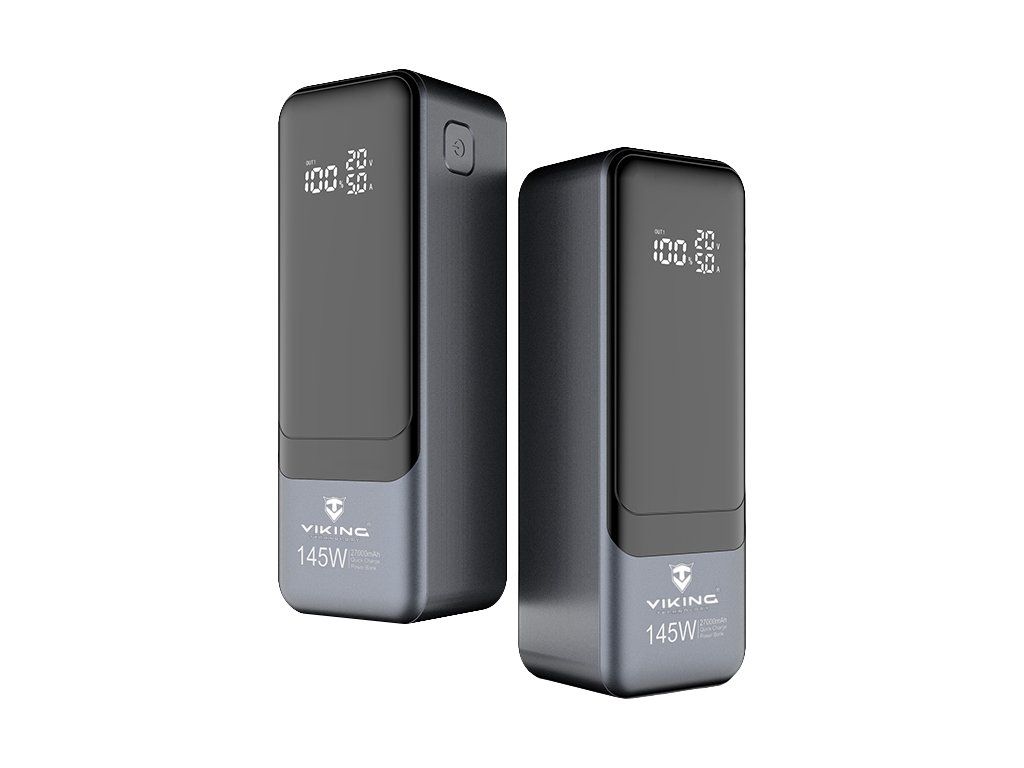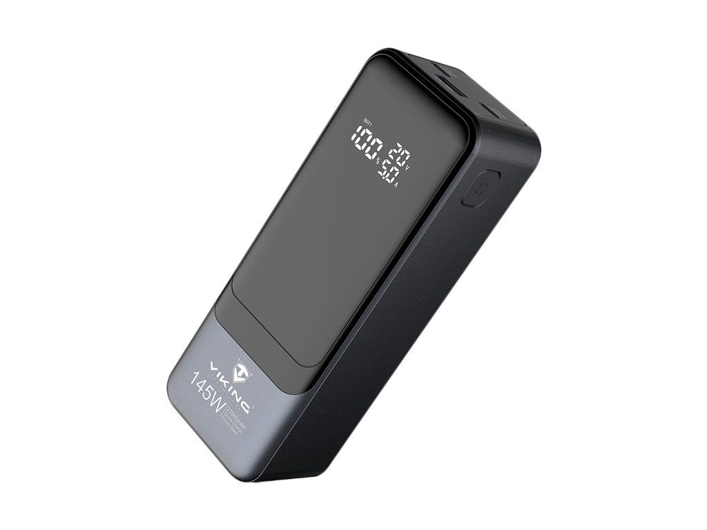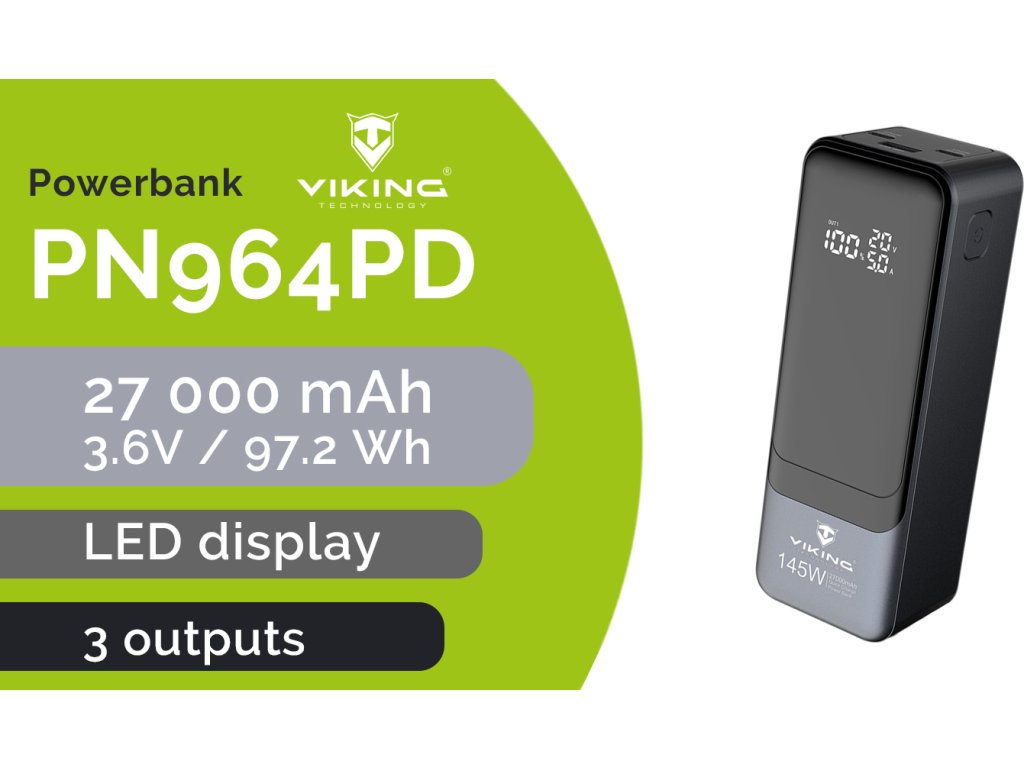 Powerbanka Viking PN-964PD 27000 mAh • Kapacita: 27000mAh/ 97.2Wh • Maximální výkon: 145W • Rychlé nabíjení PD a QC • Vstupy a výstupy (USB-A, USB-C) • Vestavěný inteligentní čip (MCU) • Funkce Pass-Through • LED display • Nabíjení notebooku