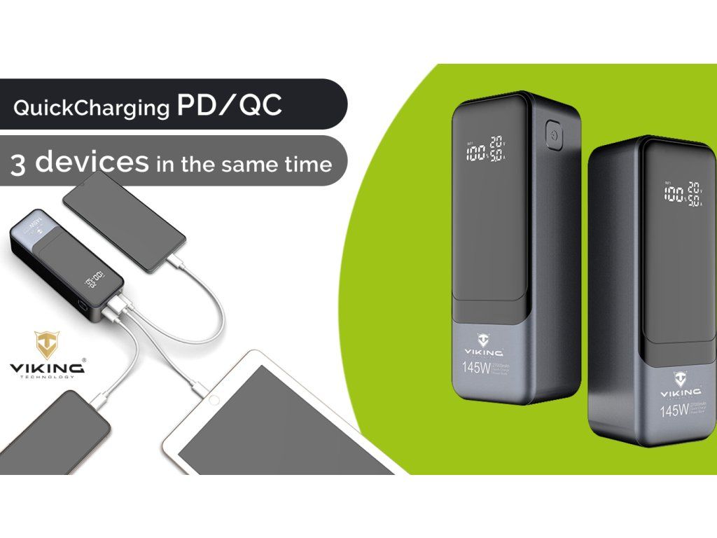 Powerbanka Viking PN-964PD 27000mAh podporuje moderní technologie rychlého nabíjení PD (Power Delivery) a QC (Quick Charge), díky kterým nabijete kompatibilní zařízení mnohem rychleji než běžnou nabíječkou – například mobil až na 50?% kapacity za krátkou dobu. Funguje jak s Androidem, tak s Apple zařízeními, pokud podporují rychlé nabíjení.