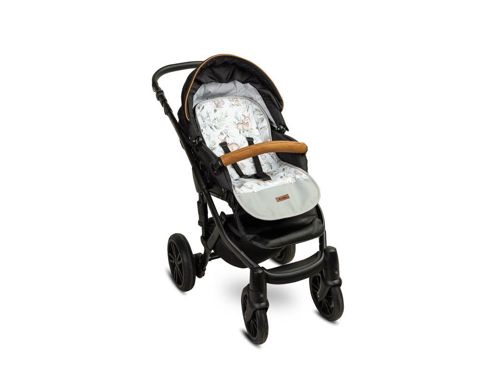 Díky univerzální vložce do kočárku s voděodolnou podnožkou může každý změnit vzhled svého kočárku. Oboustranná vsadka má z jedné strany hladkou bavlnu s módním vzorem, z druhé strany jednobarevnou bavlnu s vaflovou strukturou. Na obou stranách dole jsme přidali snadno čistitelnou barevnou ekokůži. Vložka pomáhá udržovat vnitřek kočárku čistý a zvyšuje komfort cestování . Navíc má otvory pro bezpečnostní pásy a stuhu, na kterou lze k setu připevnit polštář.