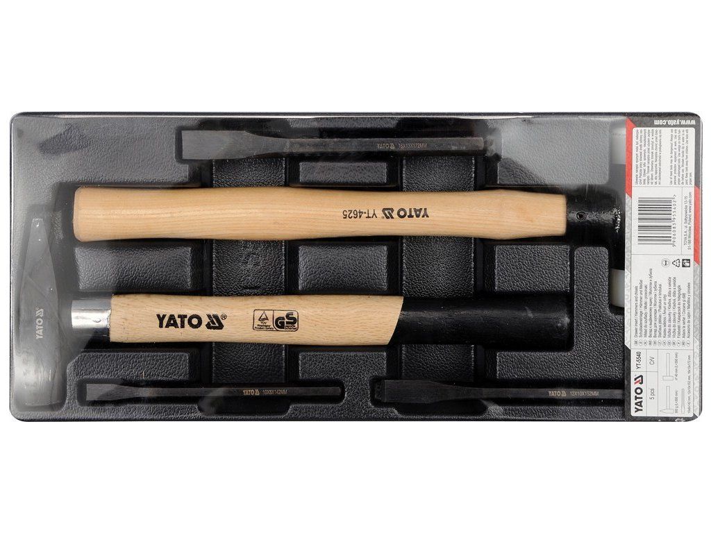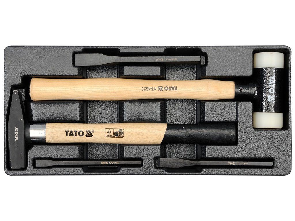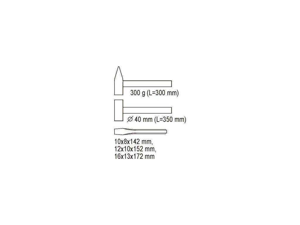 Sada 5 kusů kladiv a dlát z CrV oceli. Sada je přehledně srovnána ve vložce do zásuvky z PVC.