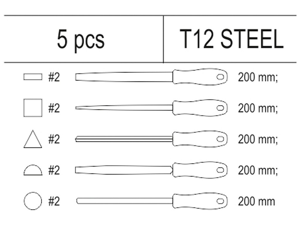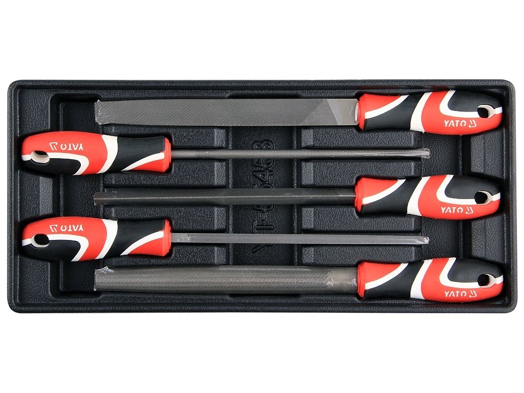 Sada 5 kusů zámečnických pilníků z oceli. Sada je přehledně srovnána ve vložce do zásuvky z PVC.