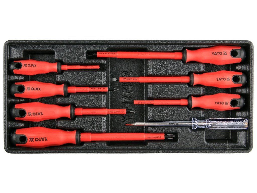 Sada 8 kusů elektrikářských šroubováků z oceli s izolací. Sada je přehledně srovnána ve vložce do zásuvky z PVC.