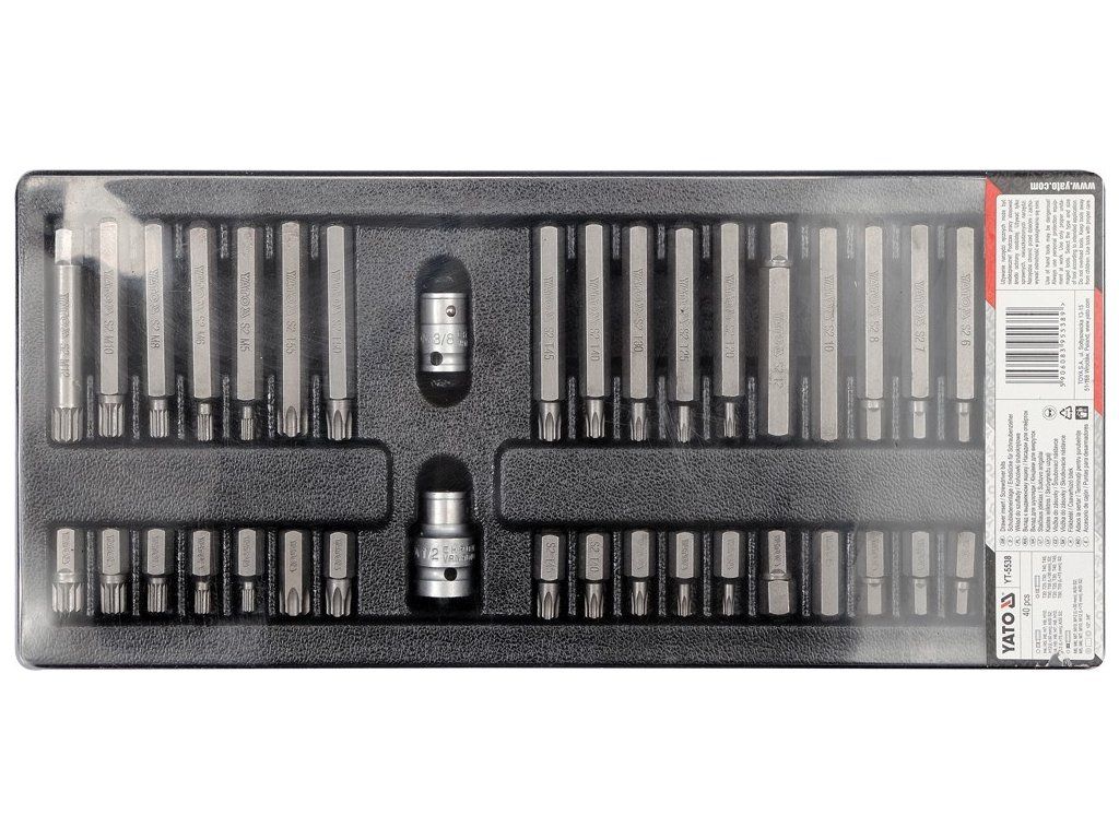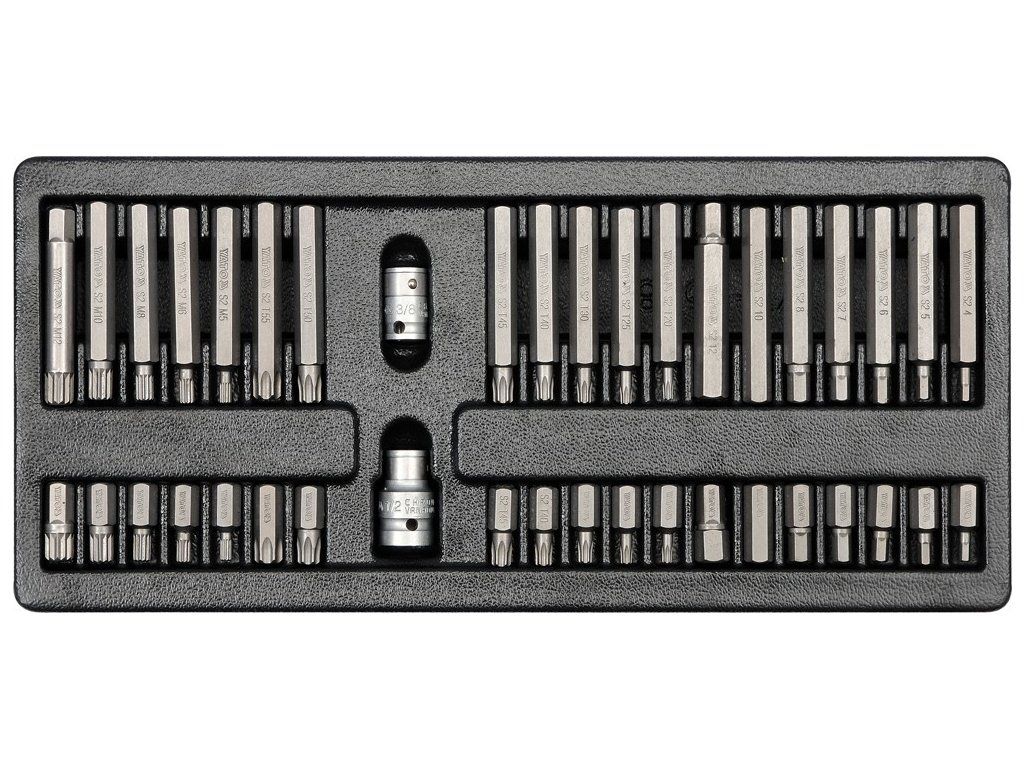 Sada 40 kusů bitů z CrV oceli. Sada bitů je přehledně srovnána ve vložce do zásuvky z PVC.