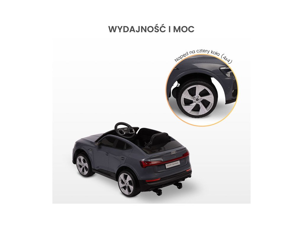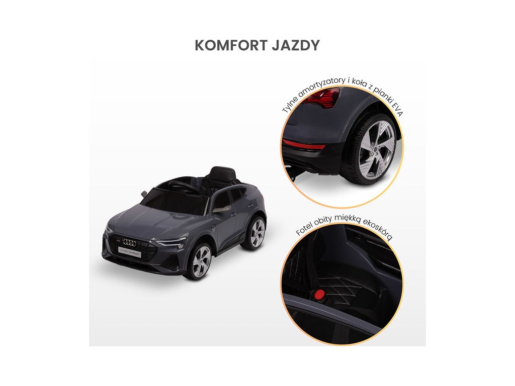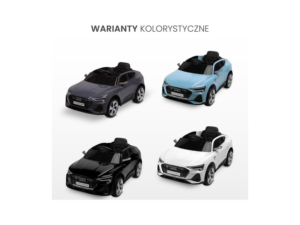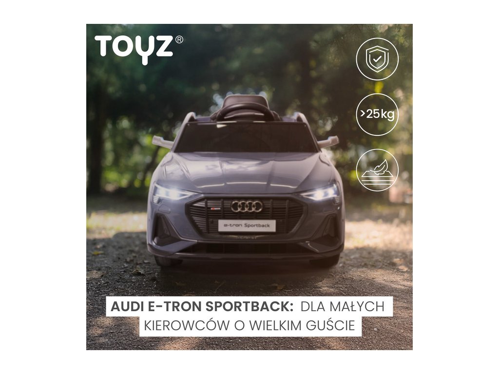 Audi E-tron Sportback je licencované vozidlo na baterie značky Toyz, které kombinuje elegantní design s dynamikou elektrického pohonu. Model se vyznačuje charakteristickou linií karoserie Audi, moderními úzkými zrcátky a propojenou zadní světelnou lištou. Vnitřní silnou stránkou modelu E-tron Sportback je pohon 4 kol s motory 45 W. Jsou napájeny 7 Ah baterií. Pohodlí a bezpečnost hry zajišťují: zadní tlumiče, EVA pěnová kola, sedačka z ekokůže, 3-bodové pásy, pomalý rozjezd, dva rychlostní režimy a automatická brzda. Autíčko na baterie má i funkce pro rodiče: dálkové ovládání a zatahovací kolečka pro snadné přenášení.