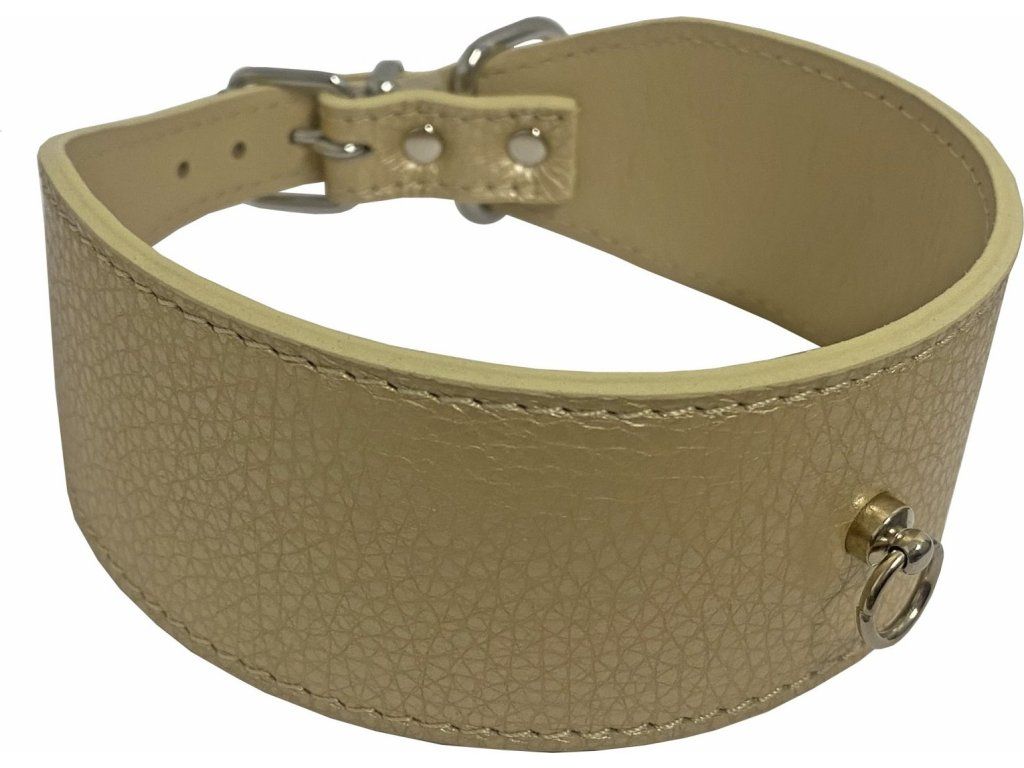 Obojek z italské vrchové vyčiněné hovězí kůže s metalickým efektem. Speciálně navržený pro chrty. Kovová spona. Kroužek na psí známku. Prošívání po celé délce obojku. Podšívka z vrchové hovězí kůže do barvy lícové strany - metalu. Vyrobeno v České republice. K dispozici je pět velikostí. Rozměr: L, 40 mm x 29-34 cm. Barva: titanová.