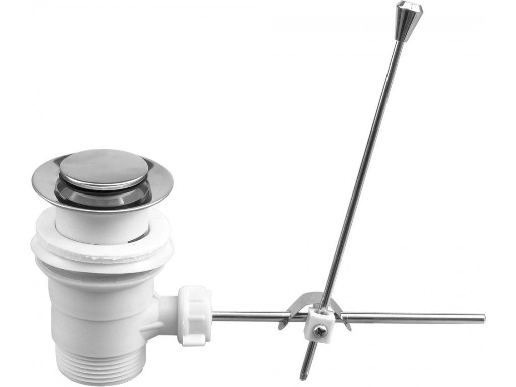 Umyvadlová výpusť, kde se zátka otevře či uzavře pomocí táhlového mechanizmu.