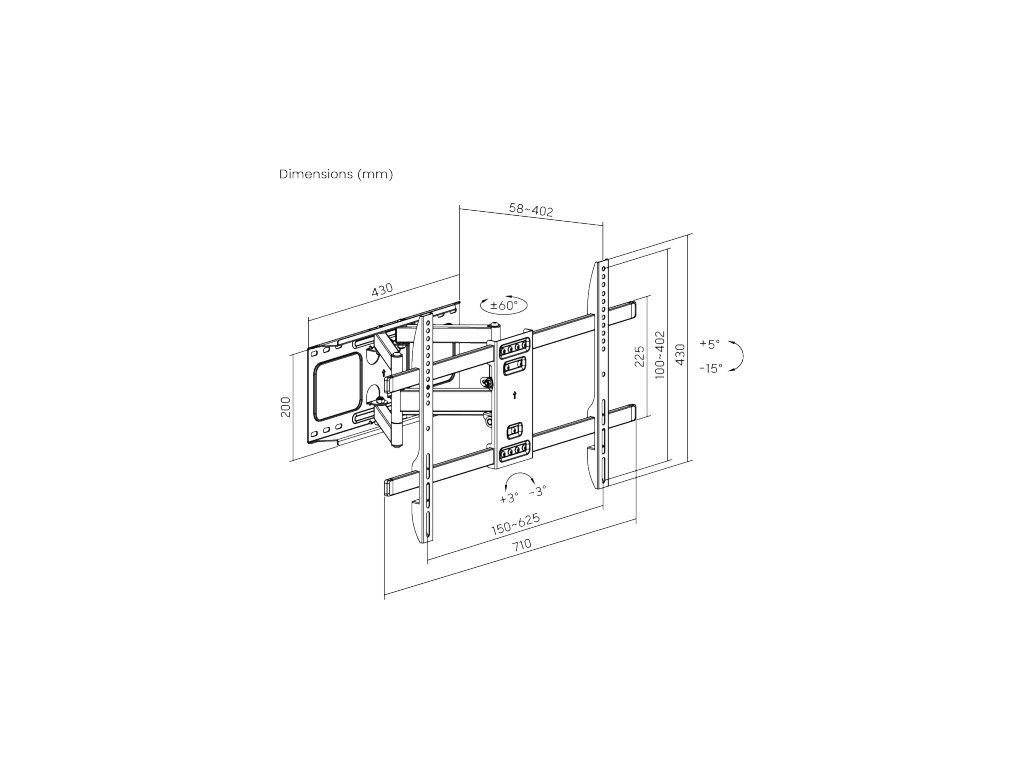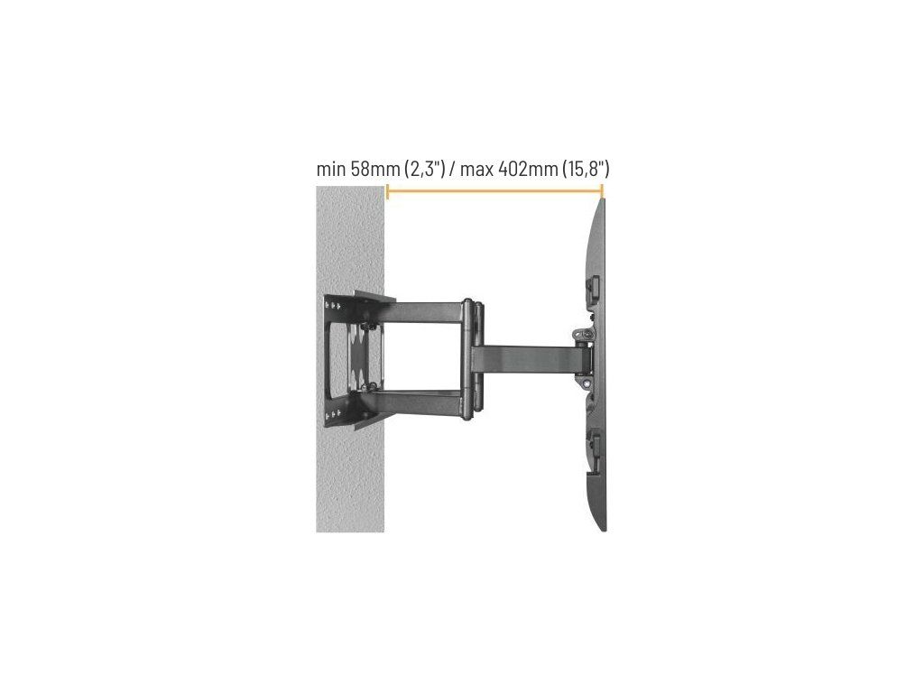 Výsuvný nástěnný držák LPA69-466 je určen pro instalaci TV s plochou obrazovkou s úhlopříčkami od 37“ do 80“. Jeho největší přednostní je robustní výsuvná heavy-duty konstrukce, díky níž unese TV o hmotnosti až 60 kg a zároveň umožňuje nastavit vzdálenost TV od stěny v rozsahu 58 mm až 402 mm, samozřejmostí je pak také velký rozsah polohování. Držák umožňuje snadné naklápění TV v rozsahu +5°~-15°, natočení do stran v rozsahu +60°~-60° a rotaci v rozsahu +3°~-3°, což maximalizuje flexibilitu sledování z libovolného místa v místnosti. Integrovaná svorka na kabely udržuje kabely uspořádané a chráněné.