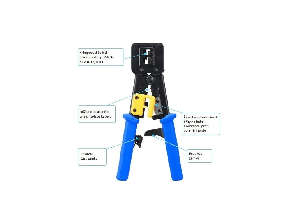 Kleště na síťové konektory typu RJ45EZ, které zjednodušují práci. Drátky vedoucí do konektoru kleště ucvaknou a zarovnají spolu s nacvaknutím konektoru na drát. Cat5e, RJ45, RJ45EZ, RJ12, včetně stíněných konektorů STP.