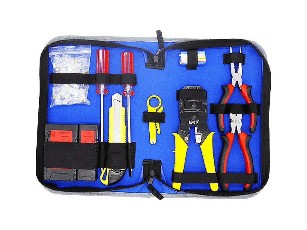 11 dílná sada nářadí pro síťaře obsahuje: tester kabelu rj45 a RJ11, krimpovací kleště RJ45, RJ12, RJ11, 6" boční štípací kleště, narážeč, 6" půlkulaté kleště s odstarňovačem izolace, koncovky RJ 45, 2x kšroubovák, nůž a další příslušenství včetně pouzdra.
