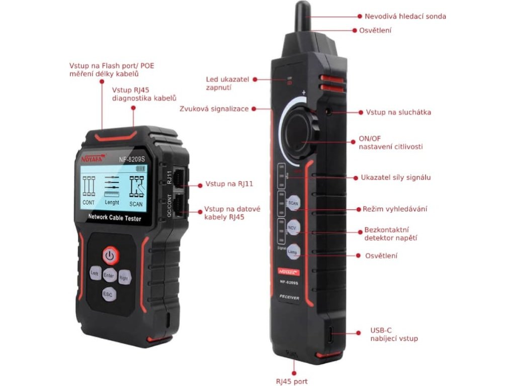 W-Star Tester kabelů UTP WSNF8209S, RJ45, Poe, hledací sonda, flash port