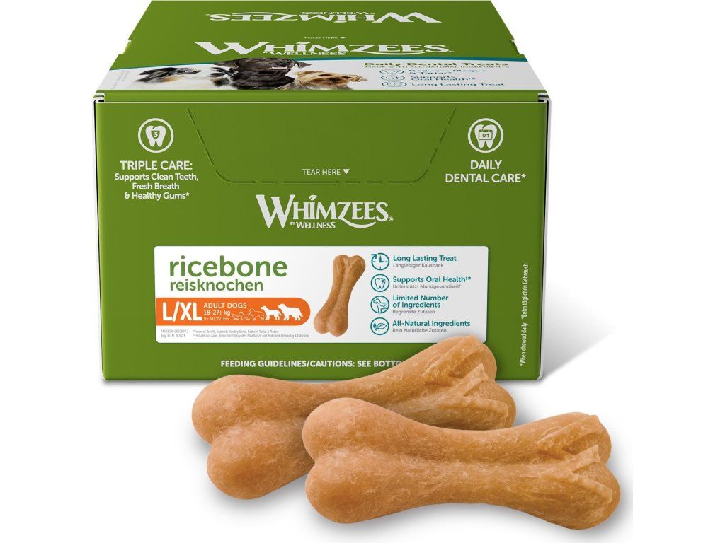 Skvělý dentální pamlsek ve tvaru kosti pro velká plemena. Tvar tyčinky je uzpůsobený tak, aby ho pes co nejvíce žvýkal, díky čemuž si zuby krásně vyčistí a skvěle se zabaví. Tyto dentální pamlsky jsou vyrobeny z čistě přírodních složek, jedná se tak o zdravý pamlsek, který napomáhá odstraňovat zubní plak. Hodí se pro každodenní použití. WHIMZEES má jedinečné přírodní, funkční přísady. Výrobek neobsahuje žádné umělé přísady, barviva, příchutě, konzervační látky, GMO, lepek nebo maso. Dentální pamlsky mají vysoký obsah vlákniny a nízký obsah kalorií a cukrů.