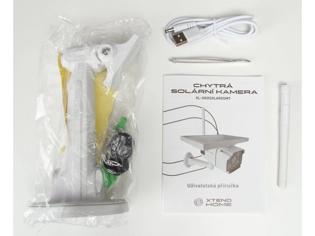 Obsah balení: kamera, solární panel, propojovací kabely, spojovací materiál, pinzeta, držák na kameru, uživatelská příručka
