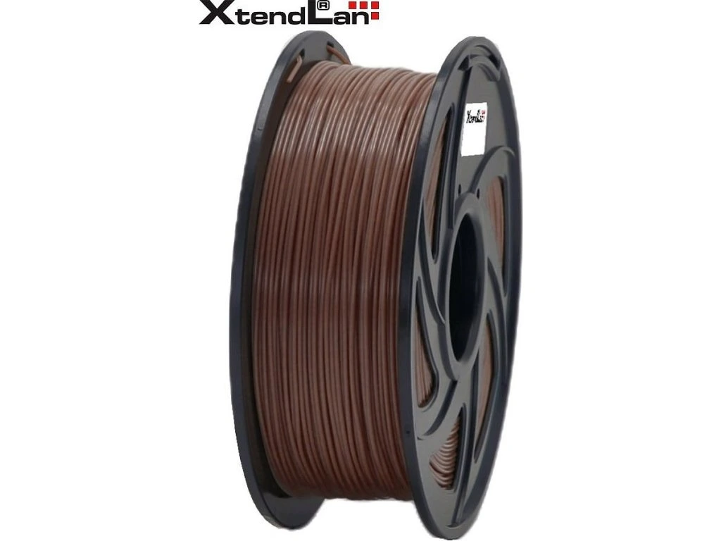 XtendLAN PLA filament 1,75 mm hnědý 1 kgPlastové vlákno (filament) pro 3D tisk, v návinu na cívce. PLA (PoLylactic Acid, kyselina polymléčná) je nejpopulárnější 3D tiskový materiál. Především se při jeho tisku neuvolňuje nepříjemný zápach a není problémem tisk na neohřívanou podložku. Je rozměrově stabilní s velmi malým tepelným smrštěním a je vhodný pro tisk i velkých objektů. Jde o biologicky odbouratelný materiál. Není vhodný do vlhkého prostředí. Při 3D tisku má velmi vhodnou přilnavost k podložce - nepotřebuje, aby podložka byla ohřívána a zároveň lze výrobek snadno z podložky sejmout. Vytištěný předmět lze ručně brousit a lakovat. Filament je chráněný vakuovým balením a v každém balení je přítomen vysoušecí sáček, který zabraňuje případnému působení vlhkosti na materiál. Dodáváno v kartónovém obalu s okénkem pro kontrolu barevnosti.