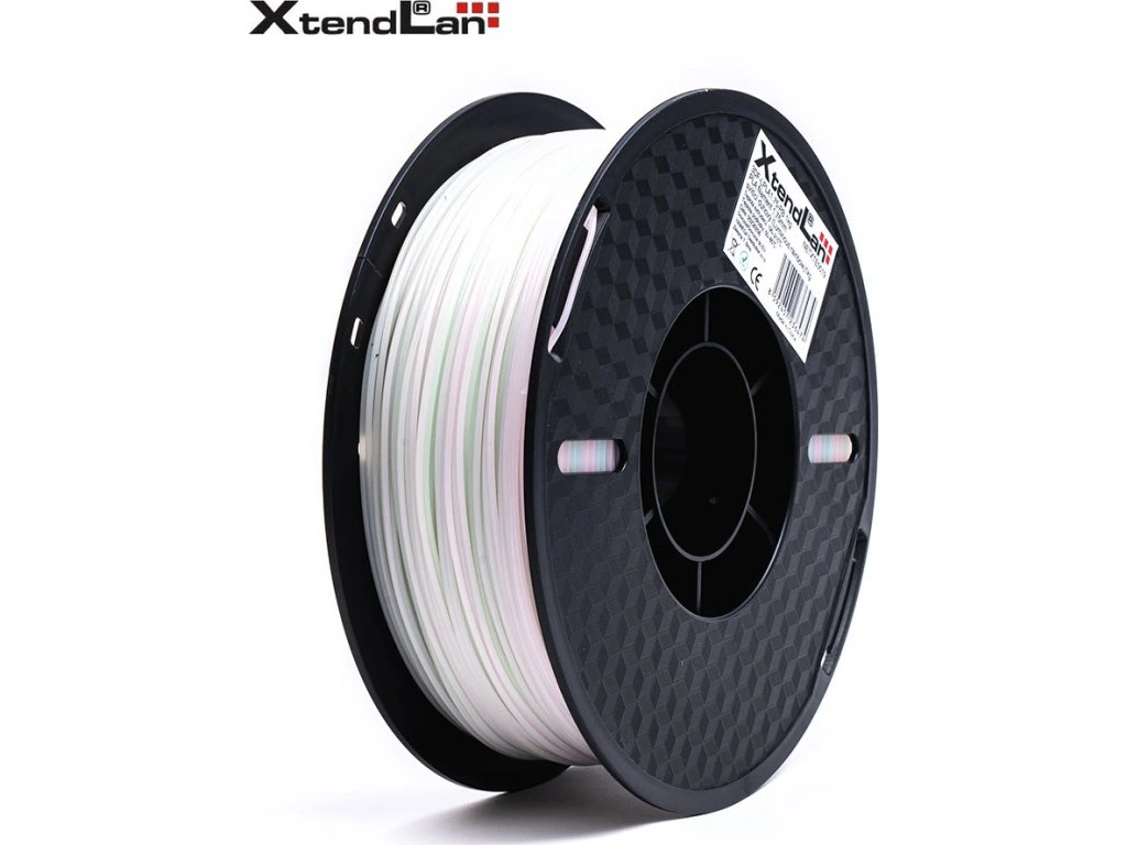 XtendLan PLA filament 1,75 mm svítící duhový 1 kgPlastové vlákno (filament) pro 3D tisk, v návinu na cívce. PLA (PoLylactic Acid, kyselina polymléčná) je nejpopulárnější 3D tiskový materiál. Především se při jeho tisku neuvolňuje nepříjemný zápach a není problémem tisk na neohřívanou podložku. Je rozměrově stabilní s velmi malým tepelným smrštěním a je vhodný pro tisk i velkých objektů. Jde o biologicky odbouratelný materiál. Není vhodný do vlhkého prostředí. Při 3D tisku má velmi vhodnou přilnavost k podložce - nepotřebuje, aby podložka byla ohřívána a zároveň lze výrobek snadno z podložky sejmout. Vytištěný předmět lze ručně brousit a lakovat. Filament je chráněný vakuovým balením a v každém balení je přítomen vysoušecí sáček, který zabraňuje případnému působení vlhkosti na materiál. Dodáváno v kartónovém obalu s okénkem pro kontrolu barevnosti.