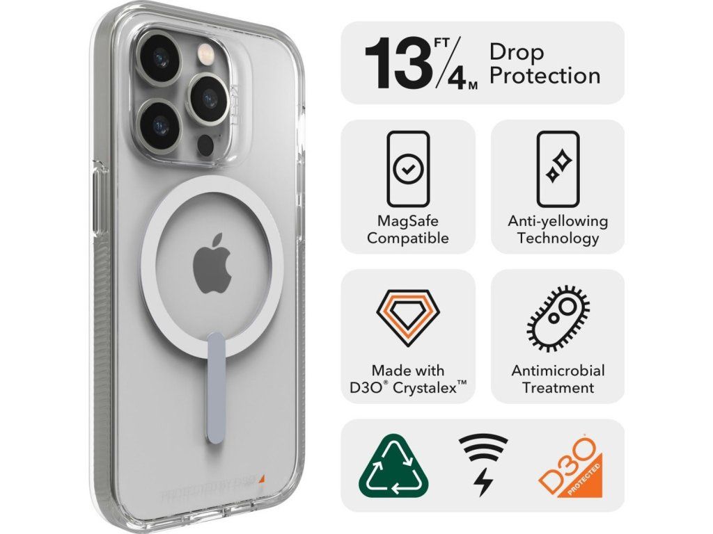 Transparentní kryt kompatibilní se systémem MagSafe vyrobený z materiálu D3O®, díky kterému zařízení ochrání při pádech z výšky až 4 metrů. Jeho povrch je obohacen o antimikrobiální vrstvu. Při výrobě krytu byl použit materiál D3O Crystalex, díky tomu deklaruje ochranu zařízení při pádech z výšky až 4 metrů. Materiál je současně vytvořen tak, aby odolával zežloutnutí a přenosu barev a zůstal křišťálově transparentní.