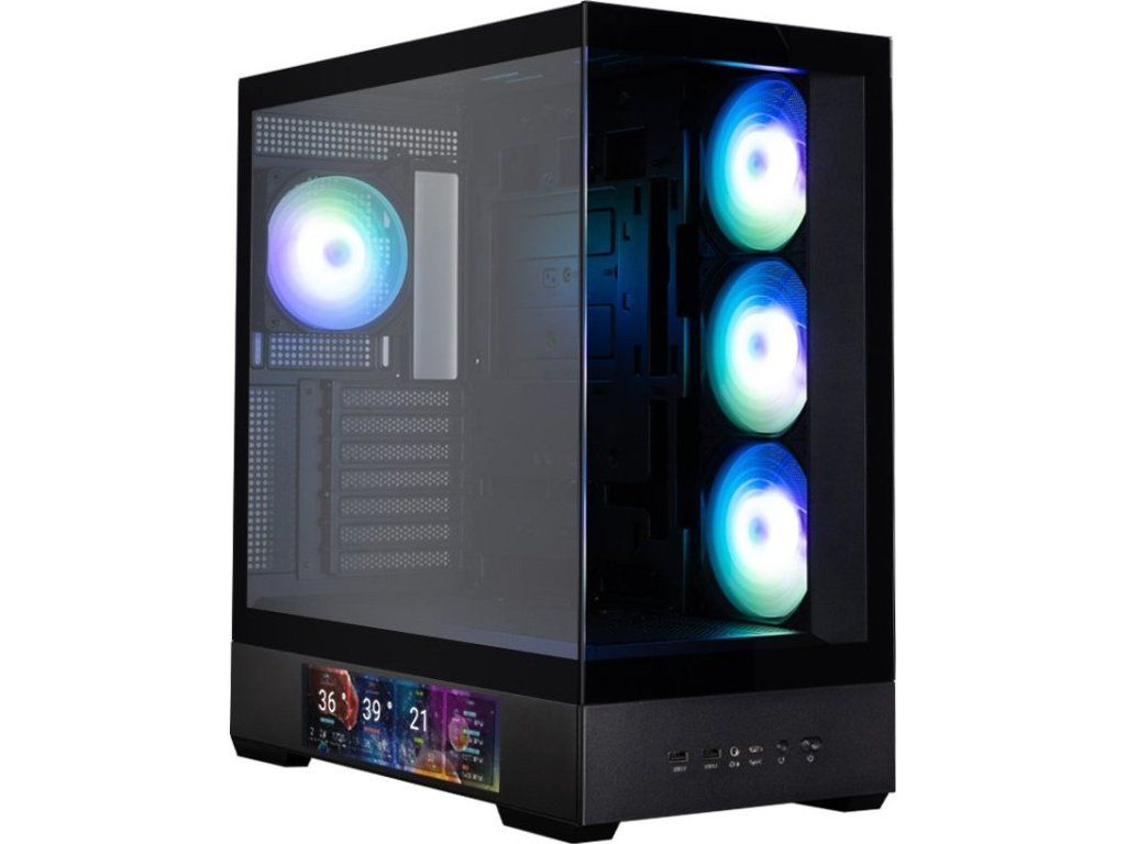 Prémiová ATX Middle Tower skříň s integrovaným 9" LCD displejem a bezrámovými skleněnými panely.