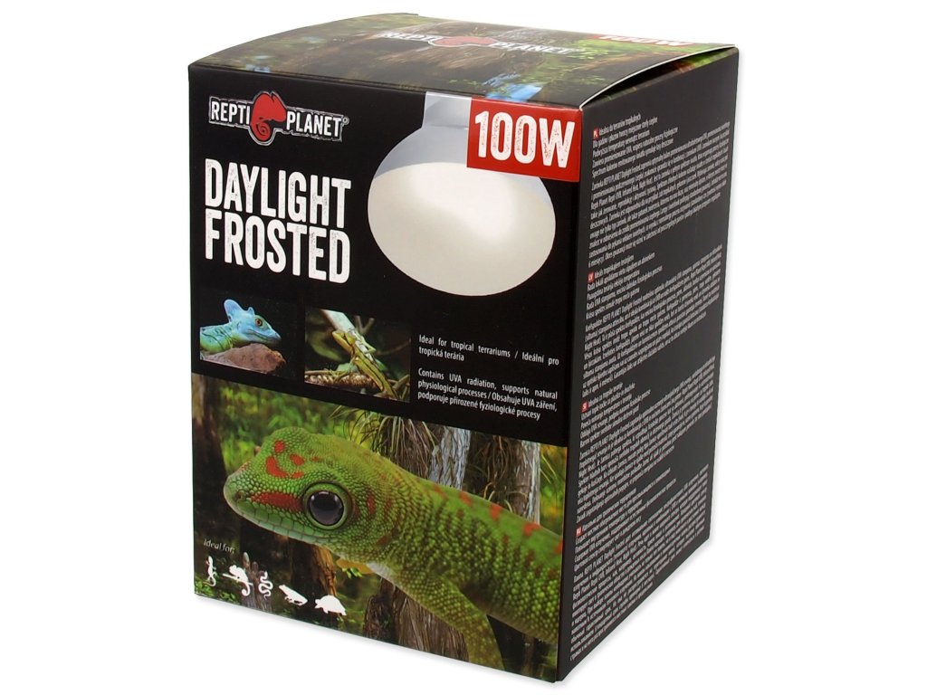 Žárovka REPTI PLANET Daylight Frosted poskytuje optimální poměr ultrafialového UVA záření, světelného záření a infračerveného (tepelného) záření a je ideální v kombinaci s UVB a nočními žárovkami (např. Repti Planet Repti UVB, Infrared Heat, Night Heat). Jedná se o širokospektrální žárovku, která podporuje fyziologické procesy jako je např. aktivita, příjem potravy a rozmnožování. Studené barevné spektrum imituje světlo v tropických oblastech a deštných pralesích. Žárovka je vhodná např. pro tropické žáby, gekony a ještěry.