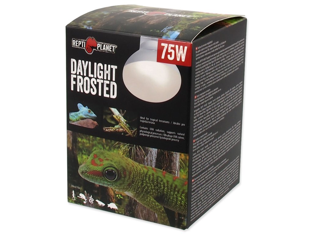 Žárovka REPTI PLANET Daylight Frosted poskytuje optimální poměr ultrafialového UVA záření, světelného záření a infračerveného (tepelného) záření a je ideální v kombinaci s UVB a nočními žárovkami (např. Repti Planet Repti UVB, Infrared Heat, Night Heat). Jedná se o širokospektrální žárovku, která podporuje fyziologické procesy jako je např. aktivita, příjem potravy a rozmnožování. Studené barevné spektrum imituje světlo v tropických oblastech a deštných pralesích. Žárovka je vhodná např. pro tropické žáby, gekony a ještěry.