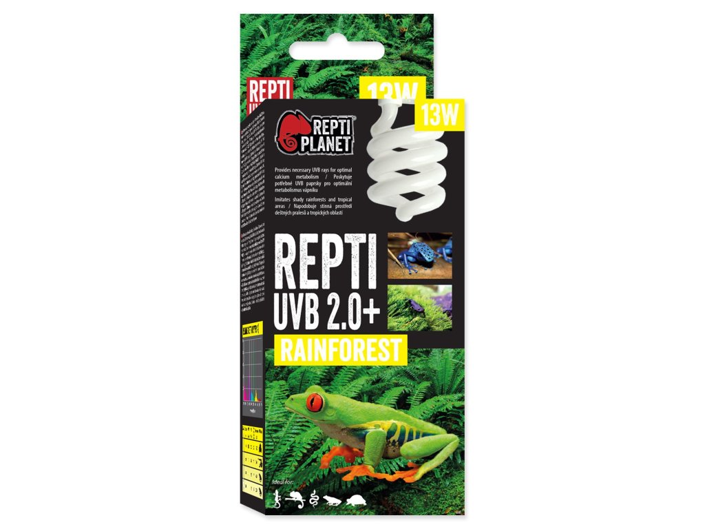 REPTI PLANET UVB 2.0+ nevyzařují dostatek tepelného a světelného záření. V případě potřeby kombinujte s výhřevnými a světelnými žárovkami (např. Repti Planet Infrared Heat, Daylight Basking Spot, Daylight Frosted, Daylight Neodymium, Far Infrared Heat nebo Night Heat). Optimální intenzita UVB záření napomáhá k přeměně vitamínu D3, který zajišťuje vstřebávání vápníku.