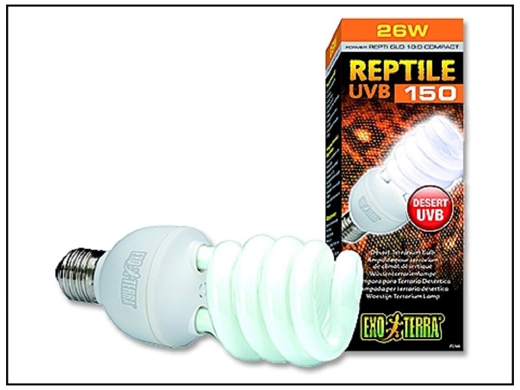 Žárovka Exo Terra Reptile UVB150 má velmi vysoké UVB záření, podobné slunci v pouštích. Tato místa jsou více vystavena přímému slunečnímu záření, proto pouštní plazi jsou vystaveni UV záření více, než jakýkoli jiný druh plaza. Tato žárovka může být také použita v teráriích s hustšími, zástěnami, aby byla zajištěna dostatečná UVB penetrace. Husté obrazovky mohou odfiltrovat až 50% z UVB záření.Typ terária: pouštní.Pro terárijní zvířata: agama vousatá, gekončík, had, leguán, suchozemská želva.Závit E27