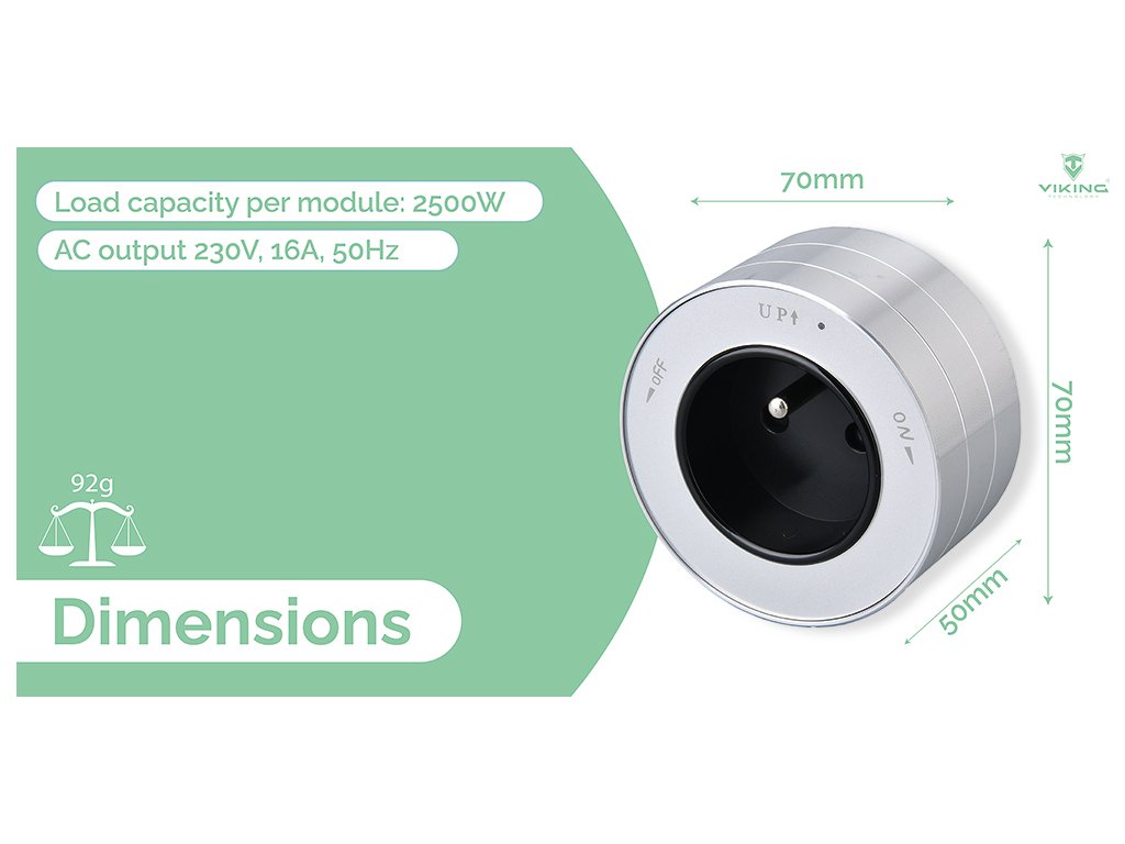 Zásuvkový modul Viking A30 je vybaven AC výstupem 230 V (16 A, 50 Hz) a je k dispozici ve třech barevných variantách.