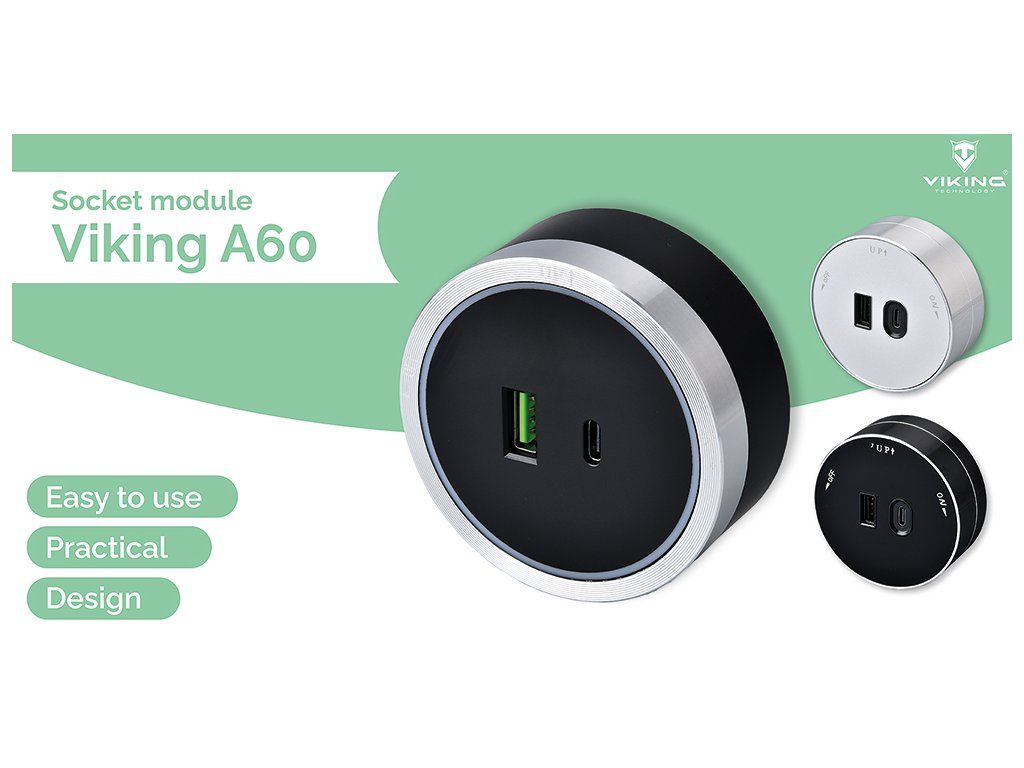 Zásuvkový modul Viking A60 je vybaven jedním USB-A výstupem (5V/2,4A) a jedním USB-C výstupem (5V/3,6A, PD) a je k dispozici ve třech barevných variantách.