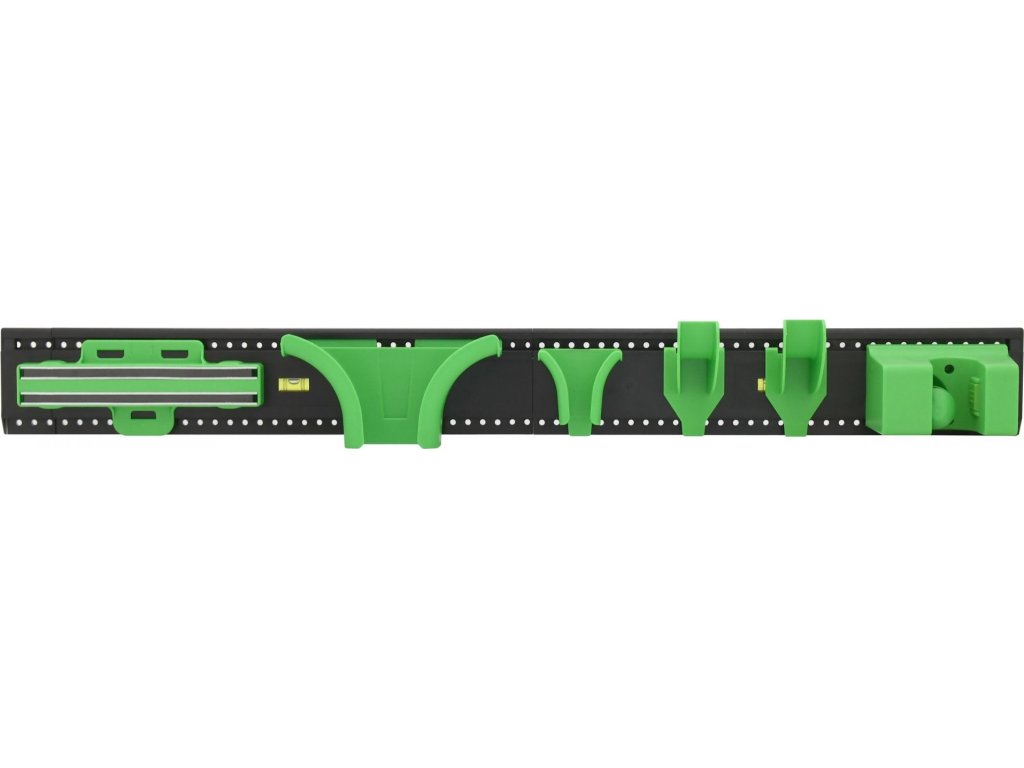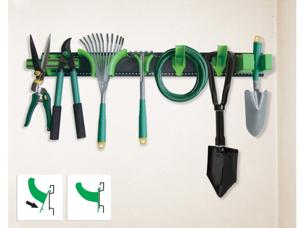 Praktický závěsný systém vhodný pro uspořádání a dlouhodobé uskladnění zahradního náčiní, hadic, lopat a jiných drobností.