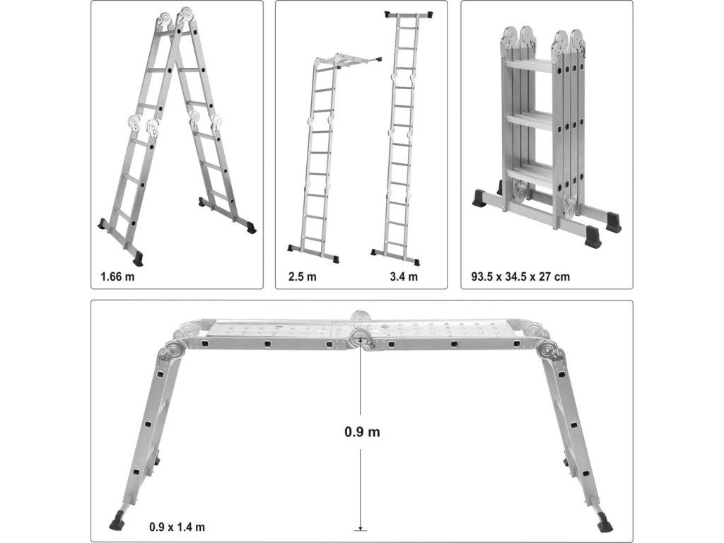 Víceúčelový skládací žebřík, 4x3 příčky, výška až 3,4 metru.