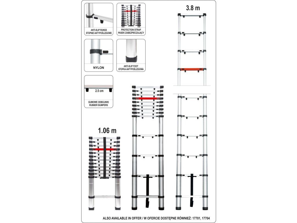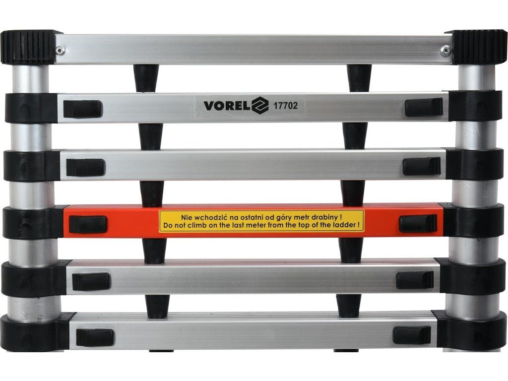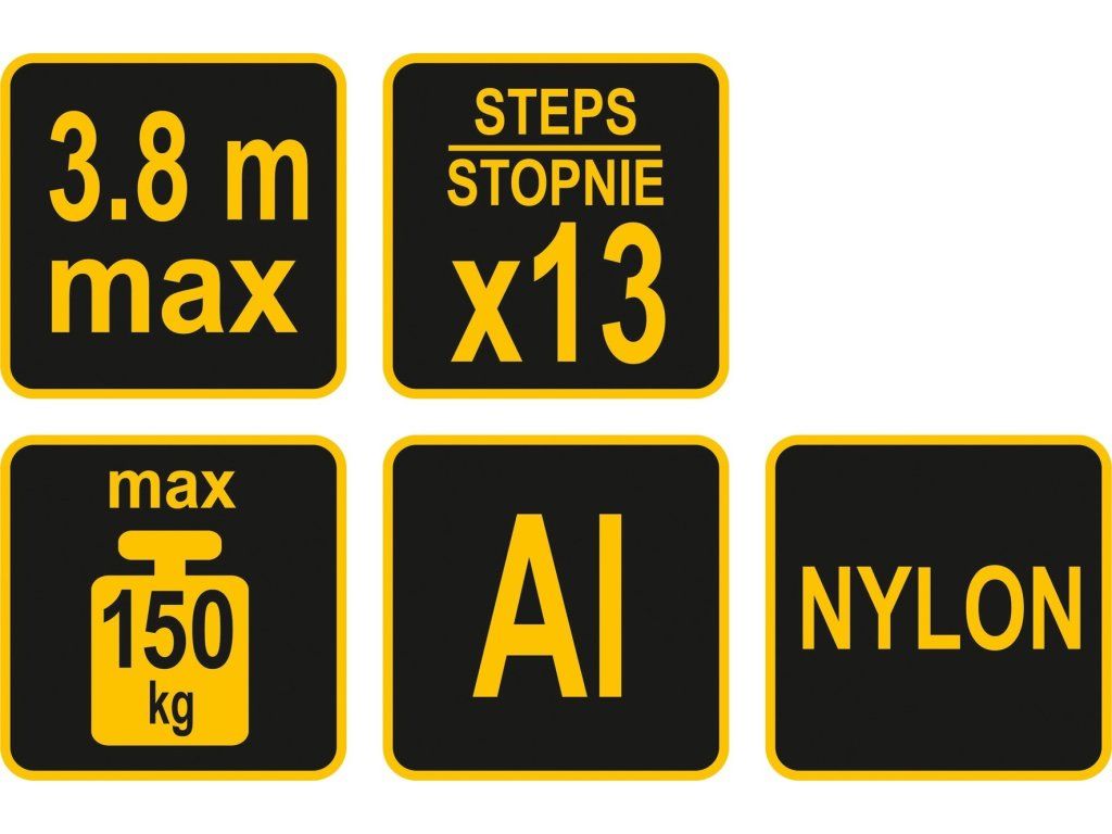 Jednotlivé stupně žebříku jsou opatřeny protiskluznou vrstvou a zvyšují tak bezpčnost použití. Značení pro maximální úroveň označuje maximální bezpečnou pracovní výšku. Nožičky žebříku jsou opatřeny gumou a zajišťují dobrou přilnavost k zemi.