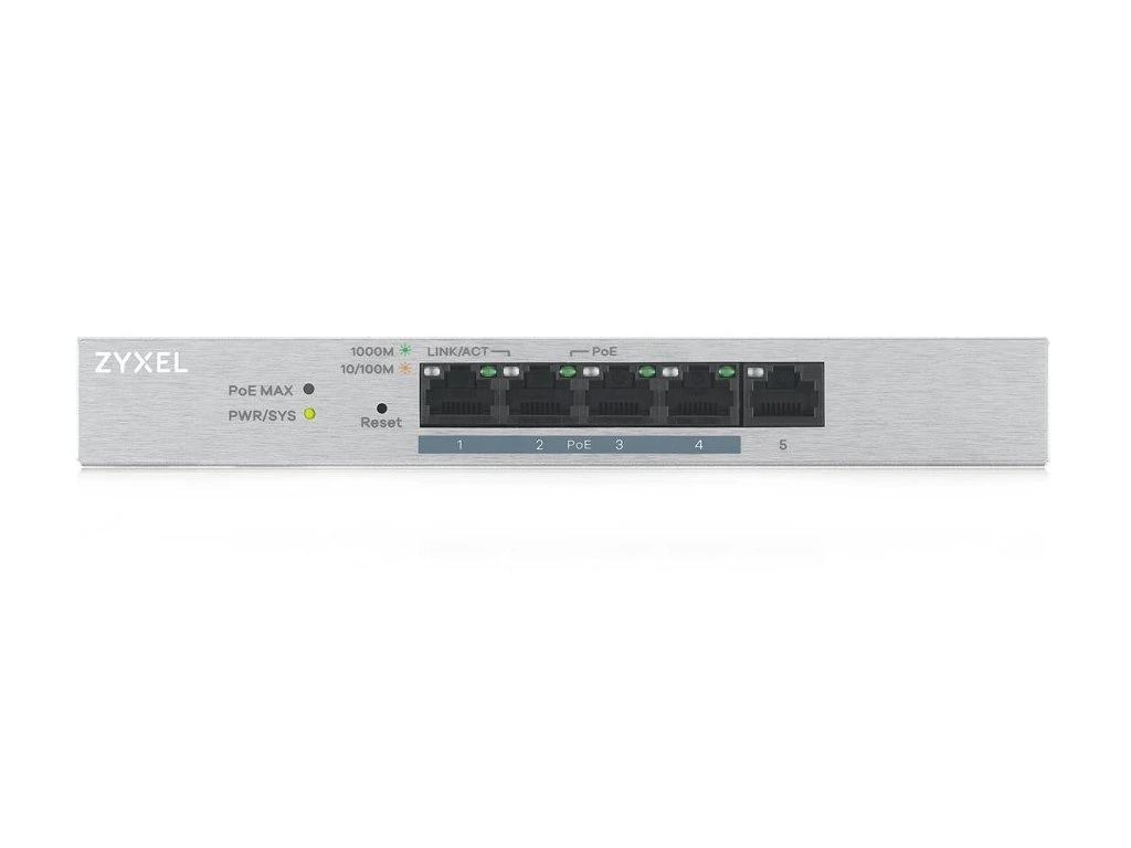 GS1200-5HPV2-EU0101F5-port Desktop Gigabit Web Smart switch: 5x Gigabit metal, 4x PoE (802.3at, 30W), PoE Power budget 60W, IPv6, 802.3az (Green), Easy set up wizard, fanless