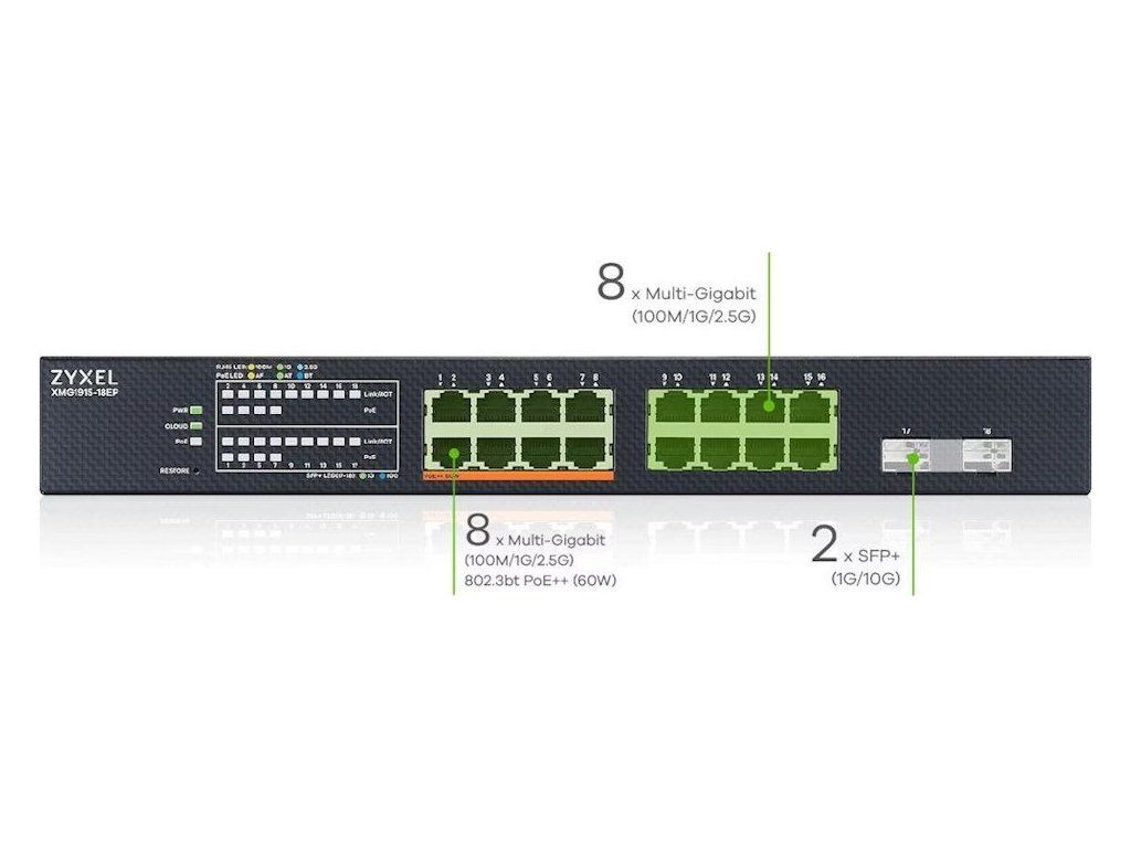 Switch ZyXEL XMG1915-18EP představuje cenově dostupné řešení pro upgrade firemní sítě na Multi-Gigabit rychlosti 2,5GbE. Všech 16 portů RJ-45 podporuje rychlosti 100 Mb/s, 1 Gb/s a 2,5 Gb/s s automatickou detekcí, přičemž prvních 8 portů disponuje napájením PoE++ podle standardu IEEE 802.3bt s výkonem až 60 W na port. Celkový PoE budget 180 W umožňuje napájet náročnější zařízení jako Wi-Fi 6/6E přístupové body, PTZ kamery nebo VoIP telefony.